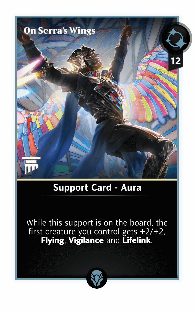 While this support is on the board, the first creature you control gets +2/+2, Flying, Vigilance and Lifelink.