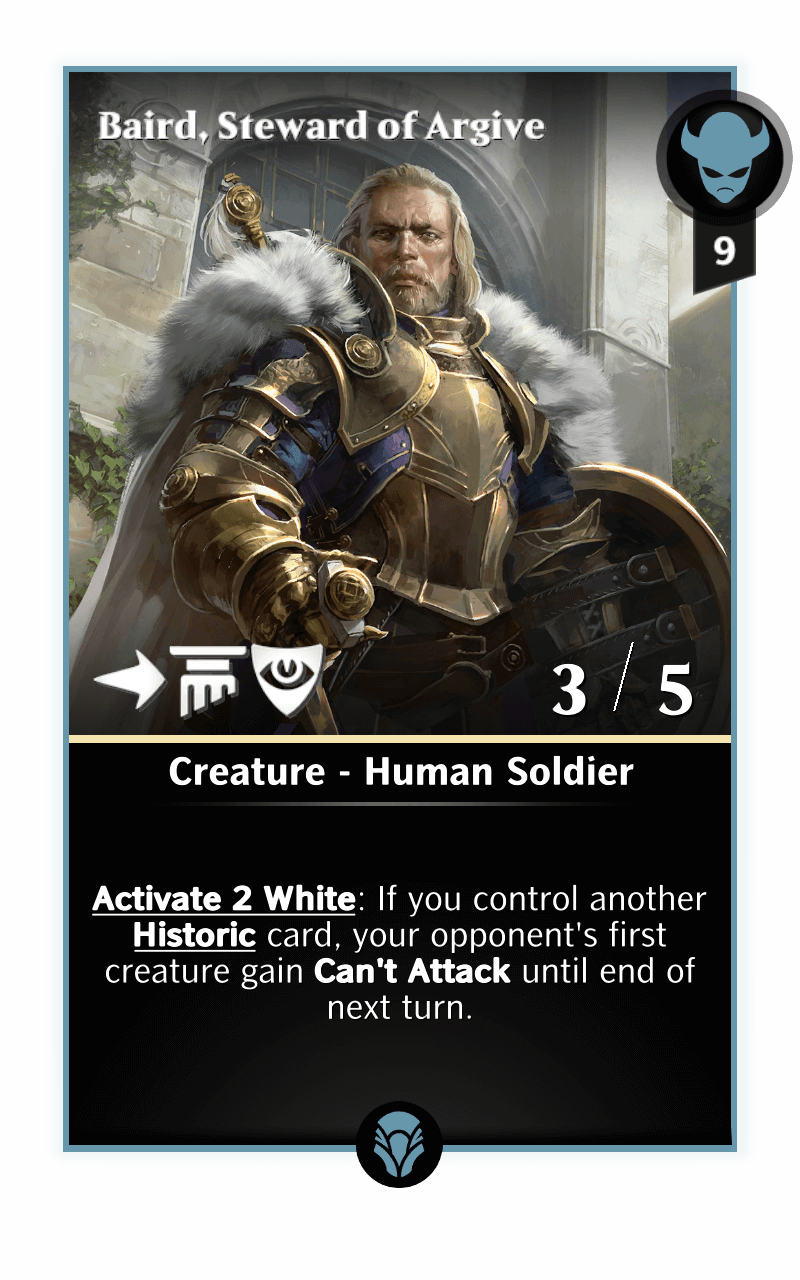 Activate 2 White: If you control another Historic card, your opponent’s first creature gain Can’t Attack until end of next turn.