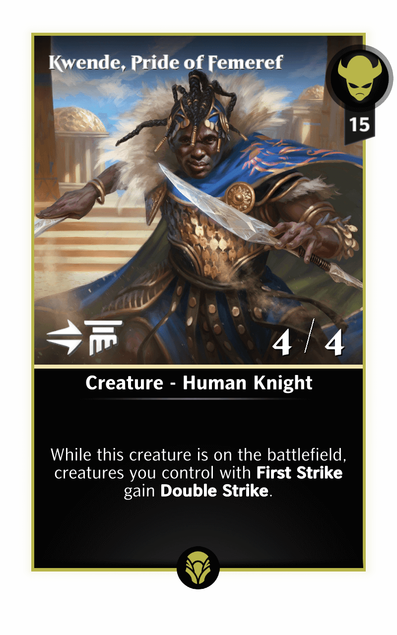 While this creature is on the battlefield, creatures you control with First Strike gain Double Strike.