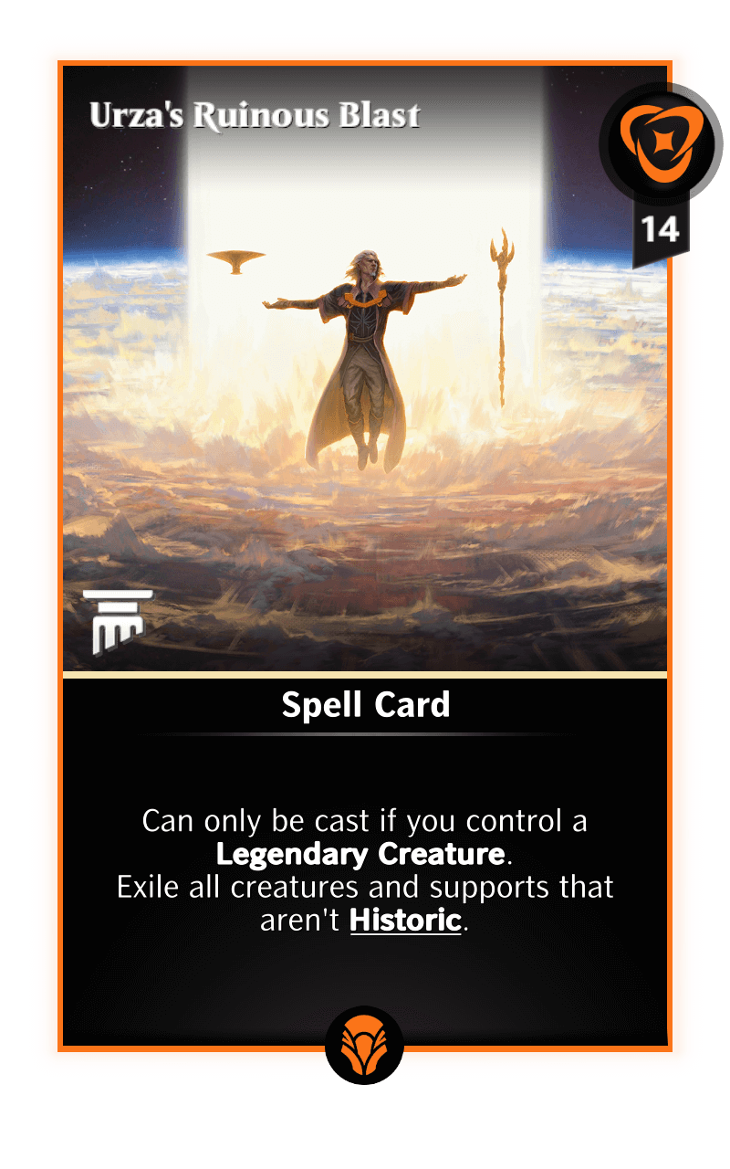 Can only be cast if you control a Legendary Creature. Exile all creatures and supports that aren’t Historic.