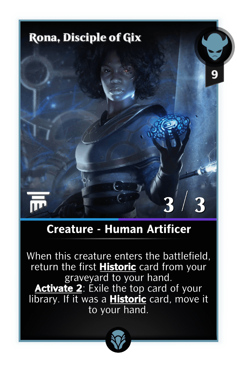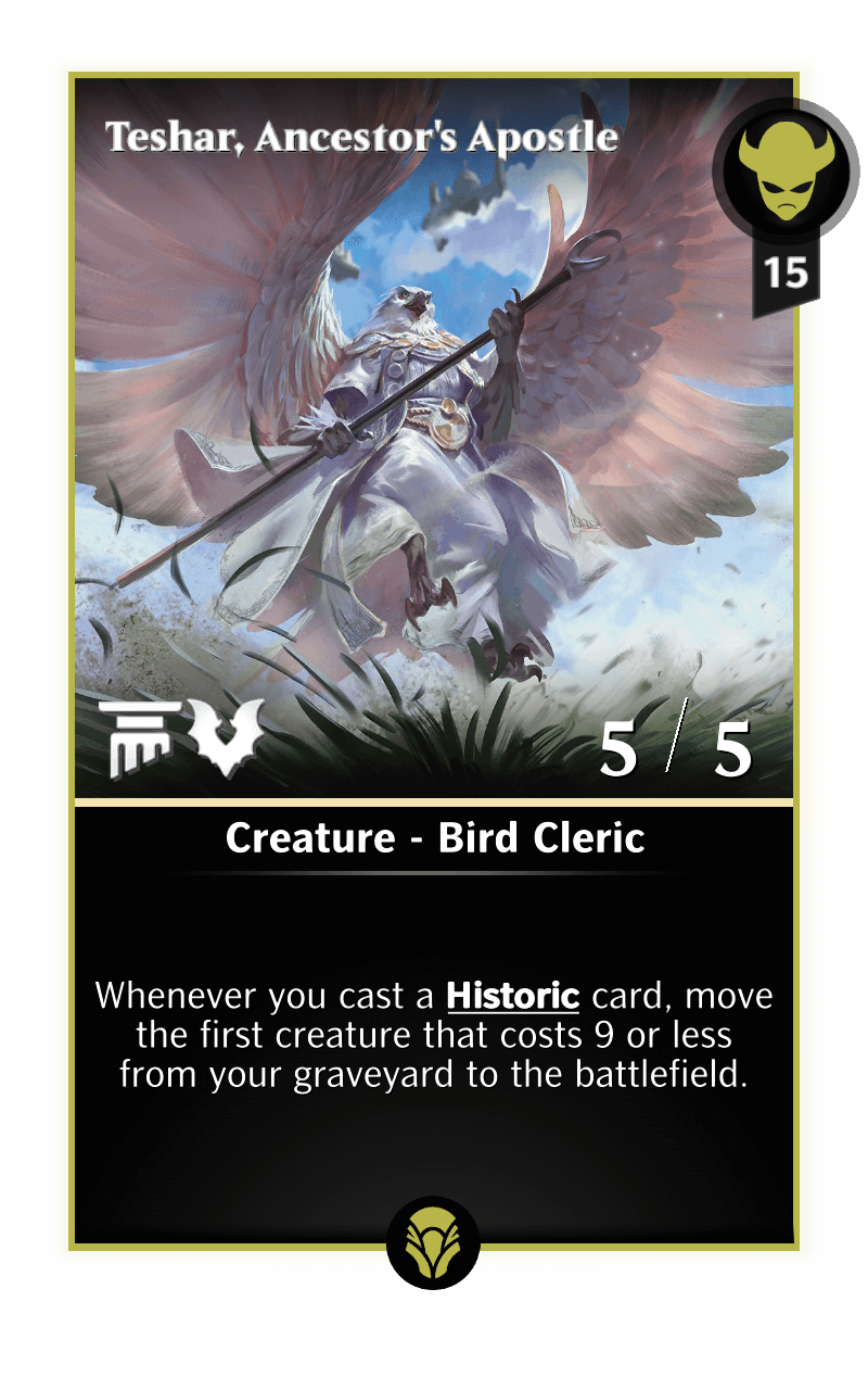 Whenever you cast a Historic card, move the first creature that costs 9 or less from your graveyard to the battlefield.