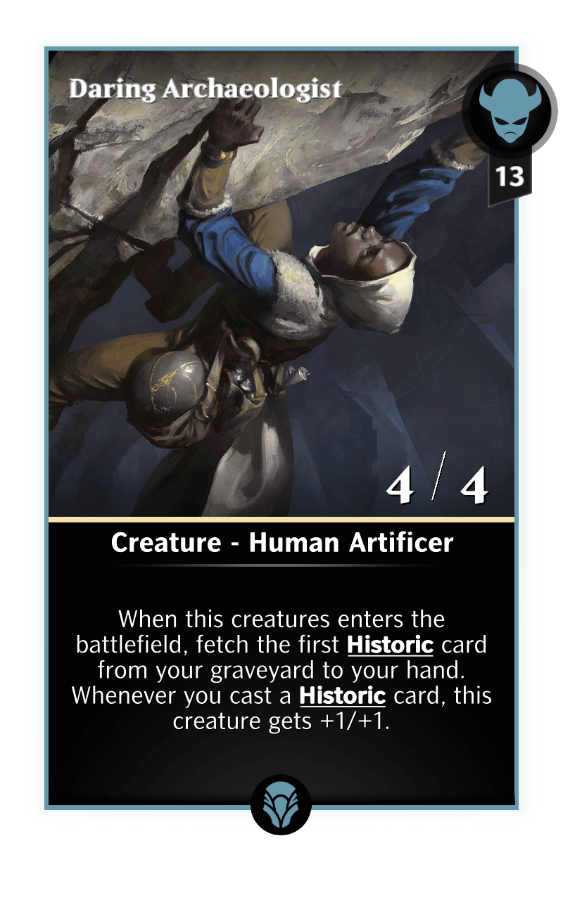When this creature enters the battlefield, return the first Historic card from your graveyard to your hand. Activate 2: Exile the top card of your library. If it was a Historic card, move it to your hand.