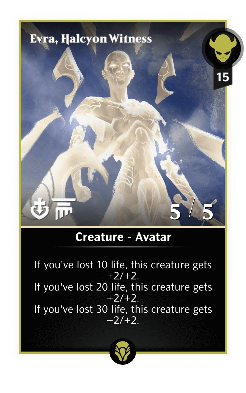If you’ve lost 10 life, this creature gets +2/+2. If you’ve lost 20 life, this creature gets +2/+2. If you’ve lost 30 life, this creature gets +2/+2.