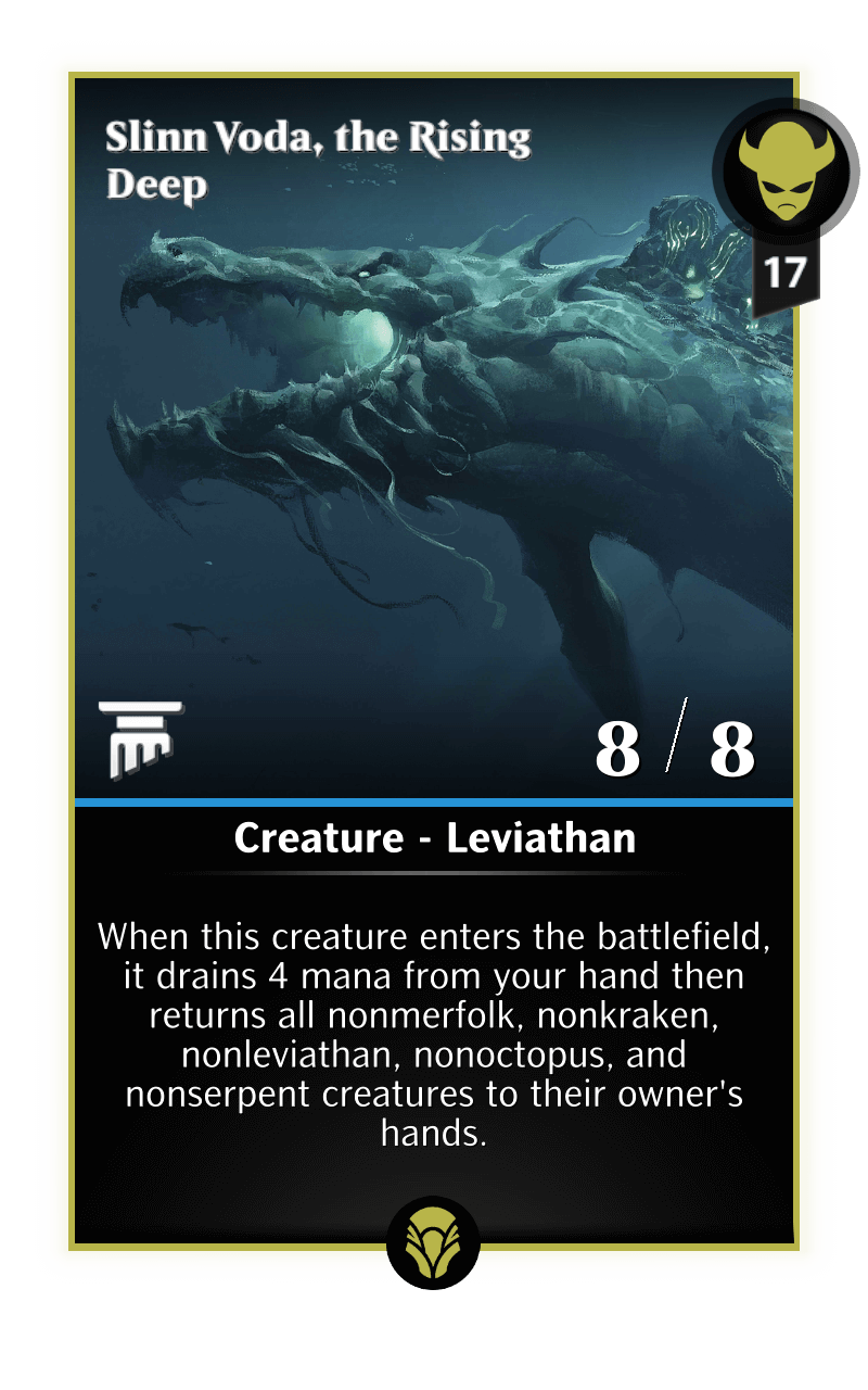 When this creature enters the battlefield, it drains 4 mana from your hand then returns all nonmerfolk, nonkraken, nonleviathan, nonoctopus, and nonserpent creatures to their owner’s hands.