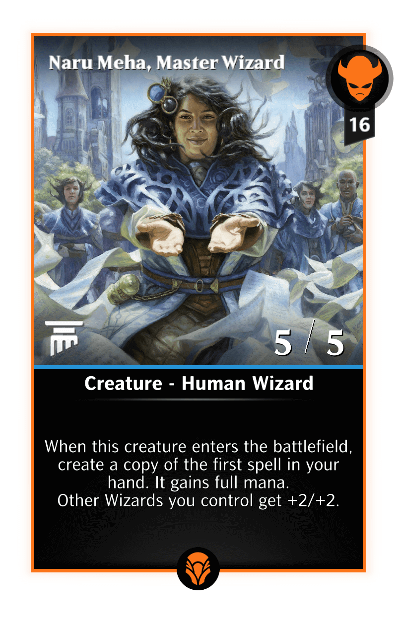 When this creature enters the battlefield, create a copy of the first spell in your hand. It gains full mana. Other Wizards you control get +2/+2.