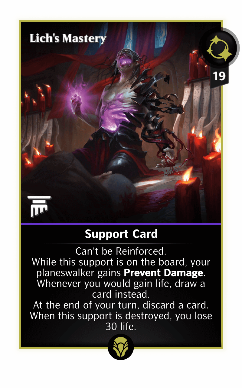 Can’t be Reinforced. While this support is on the board, your planeswalker gains Prevent Damage. Whenever you would gain life, draw a card instead. At the end of your turn, discard a card. When this support is destroyed, you lose 30 life.