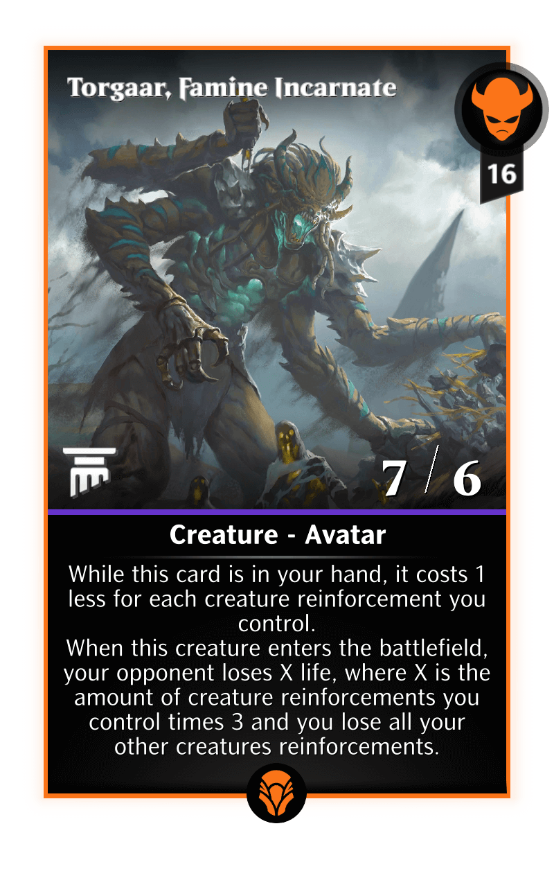 While this card is in your hand, it costs 1 less for each creature reinforcement you control. When this creature enters the battlefield, your opponent loses X life, where X is the amount of creature reinforcements you control times 3 and you lose all your other creatures reinforcements.