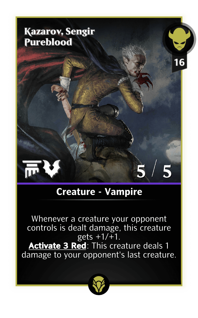Whenever a creature your opponent controls is dealt damage, this creature gets +1/+1. Activate 3 Red: This creature deals 1 damage to your opponent’s last creature.