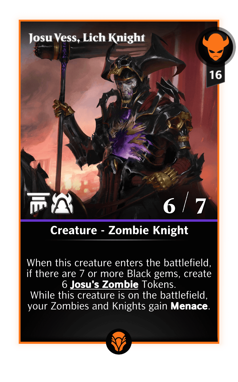 When this creature enters the battlefield, if there are 7 or more Black gems, create 6 Josu’s Zombie Tokens. While this creature is on the battlefield, your Zombies and Knights gain Menace.