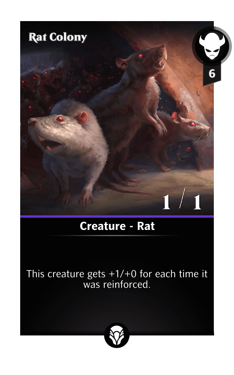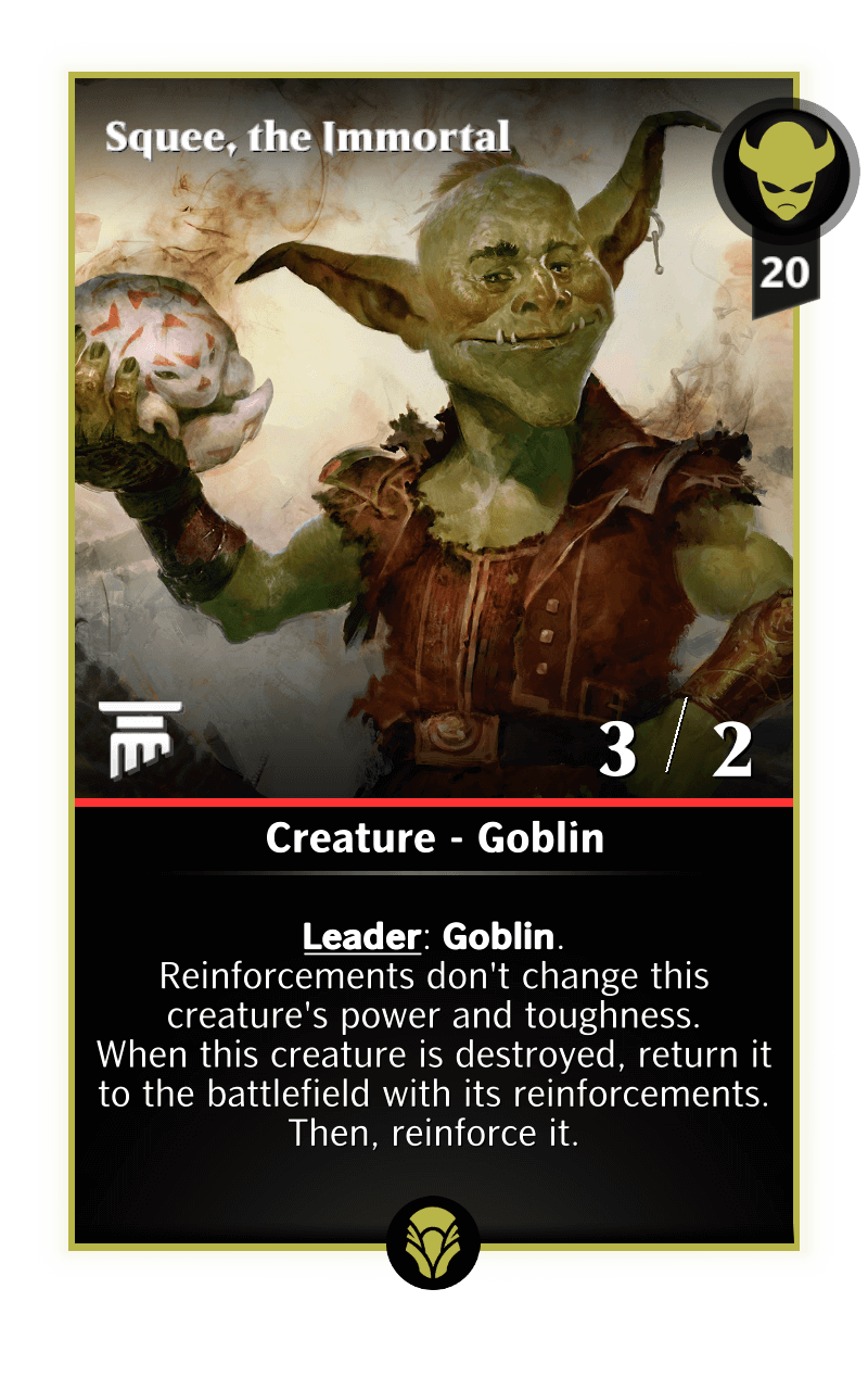 Leader: Goblin. Reinforcements don’t change this creature’s power and toughness. When this creature is destroyed, return it to the battlefield with its reinforcements. Then, reinforce it.