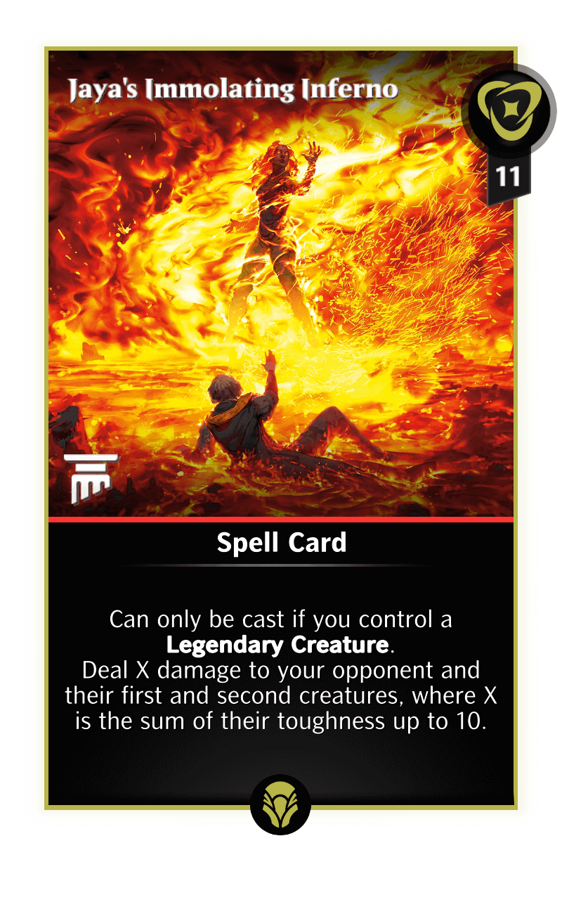 Can only be cast if you control a Legendary Creature. Deal X damage to your opponent and their first and second creatures, where X is the sum of their toughness up to 10.