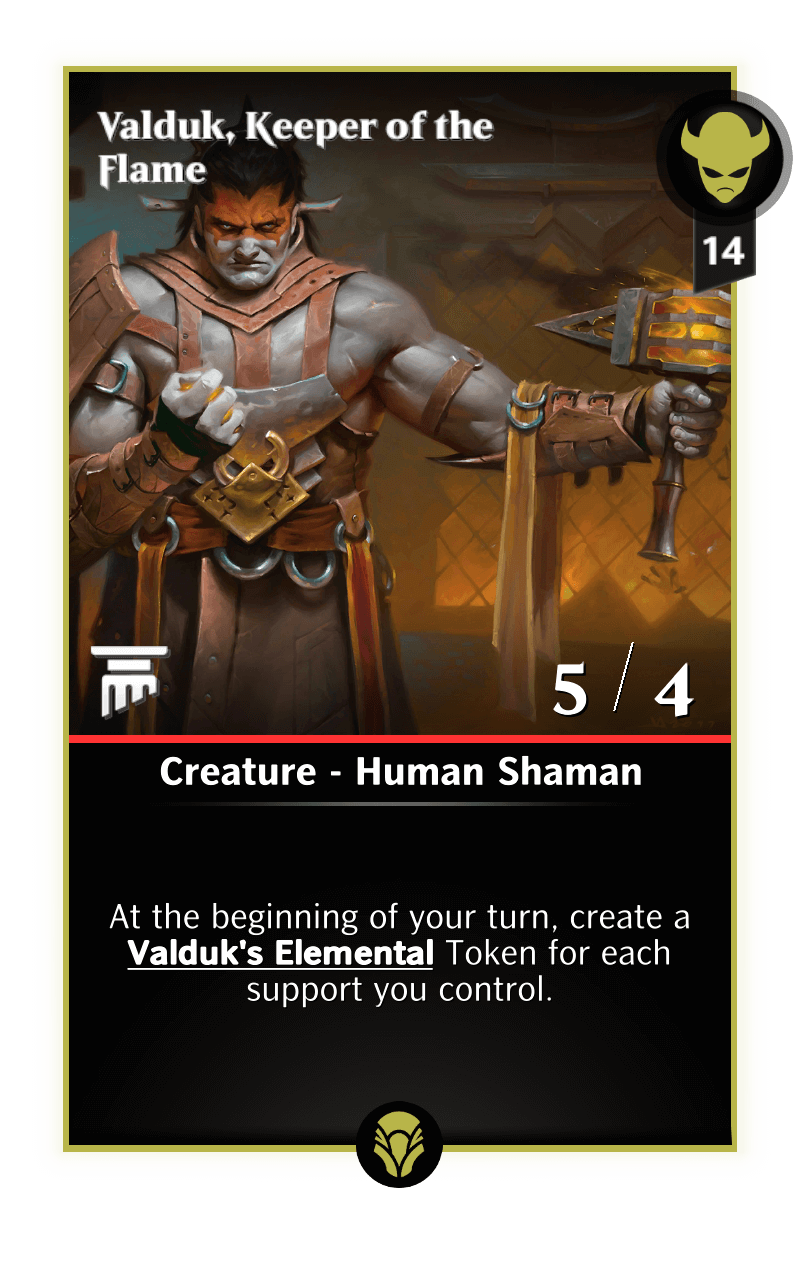 At the beginning of your turn, create a Valduk’s Elemental Token for each support you control.
