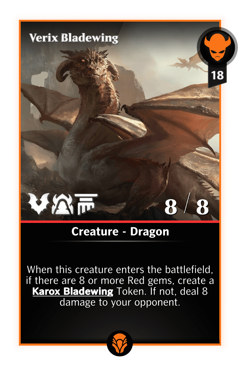 When this creature enters the battlefield, if there are 8 or more Red gems, create a Karox Bladewing Token. If not, deal 8 damage to your opponent.