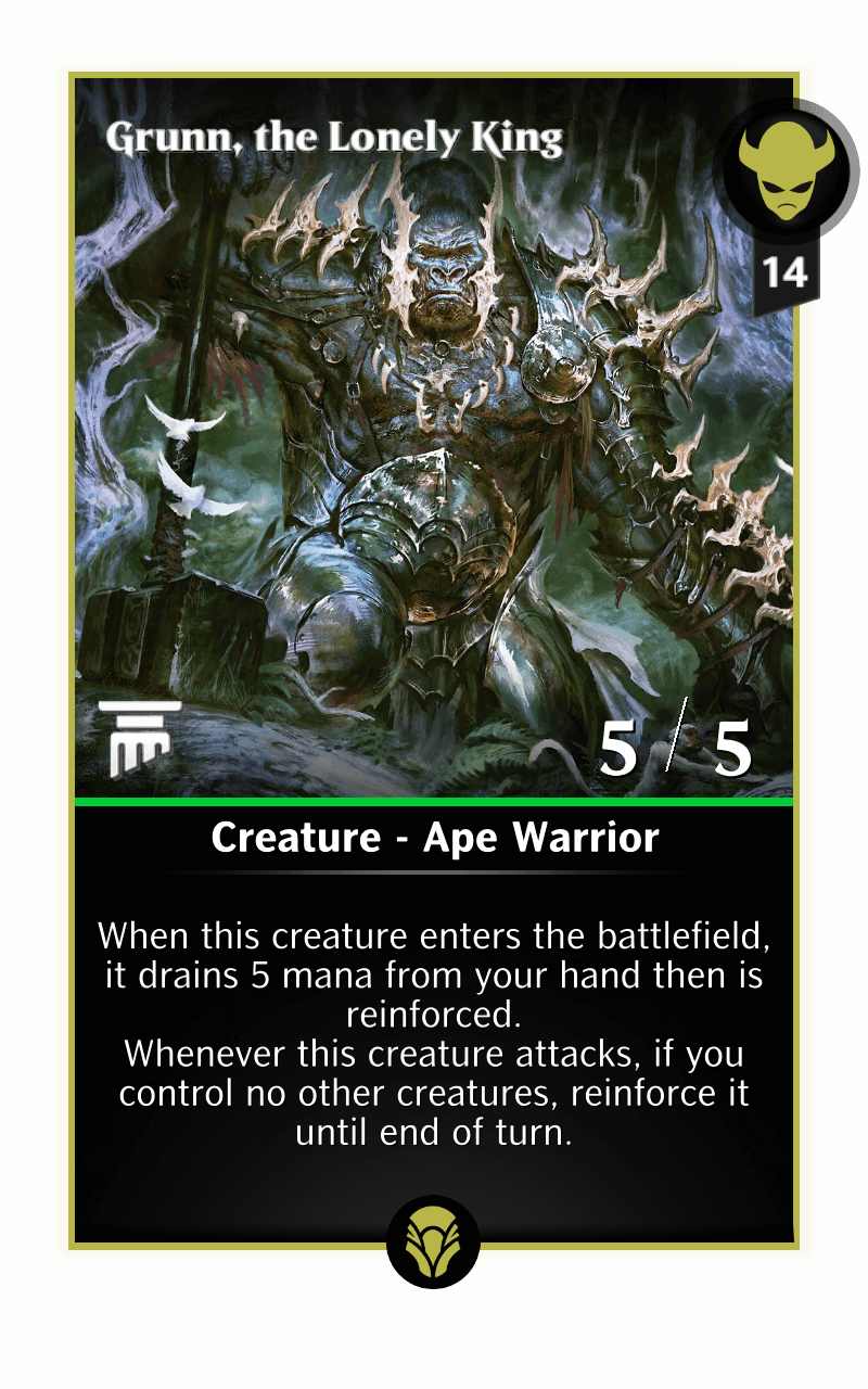 When this creature enters the battlefield, it drains 5 mana from your hand then is reinforced. Whenever this creature attacks, if you control no other creatures, reinforce it until end of turn.