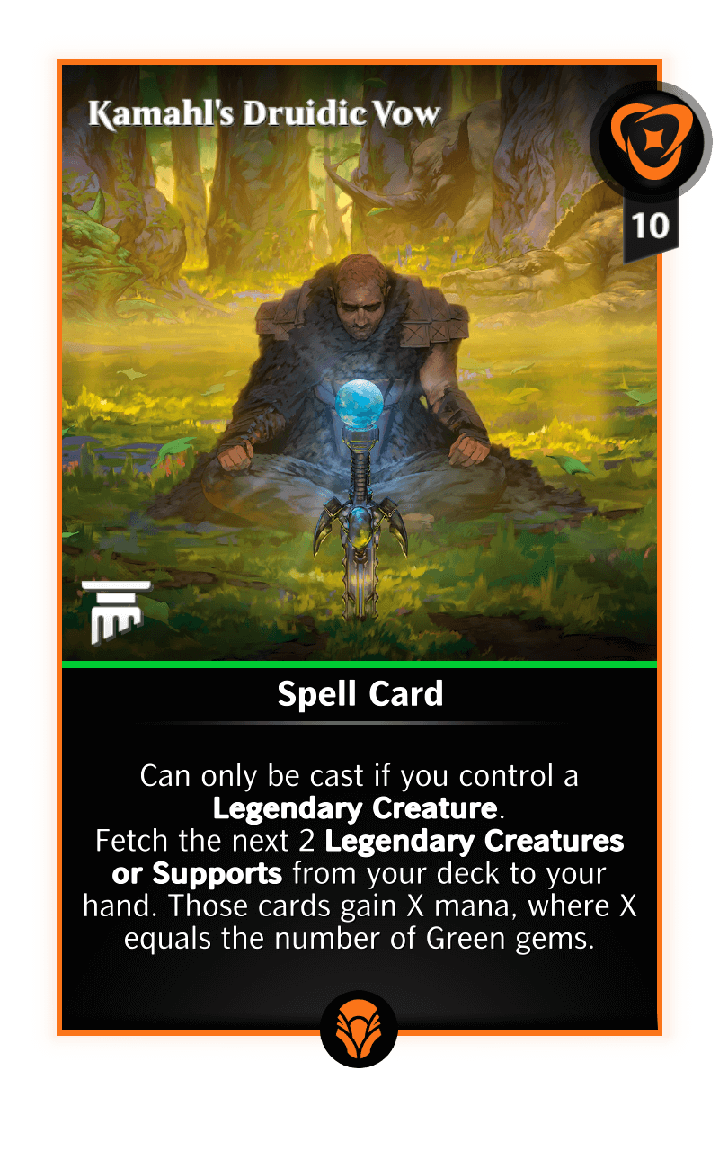 Can only be cast if you control a Legendary Creature. Fetch the next 2 Legendary Creatures or Supports from your deck to your hand. Those cards gain X mana, where X equals the number of Green gems.