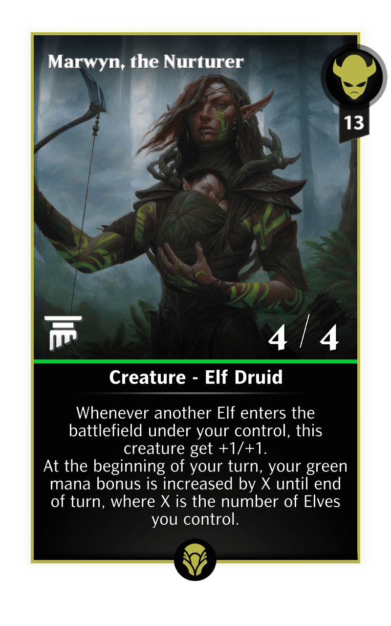 Whenever another Elf enters the battlefield under your control, this creature get +1/+1. At the beginning of your turn, your green mana bonus is increased by X until end of turn, where X is the number of Elves you control.