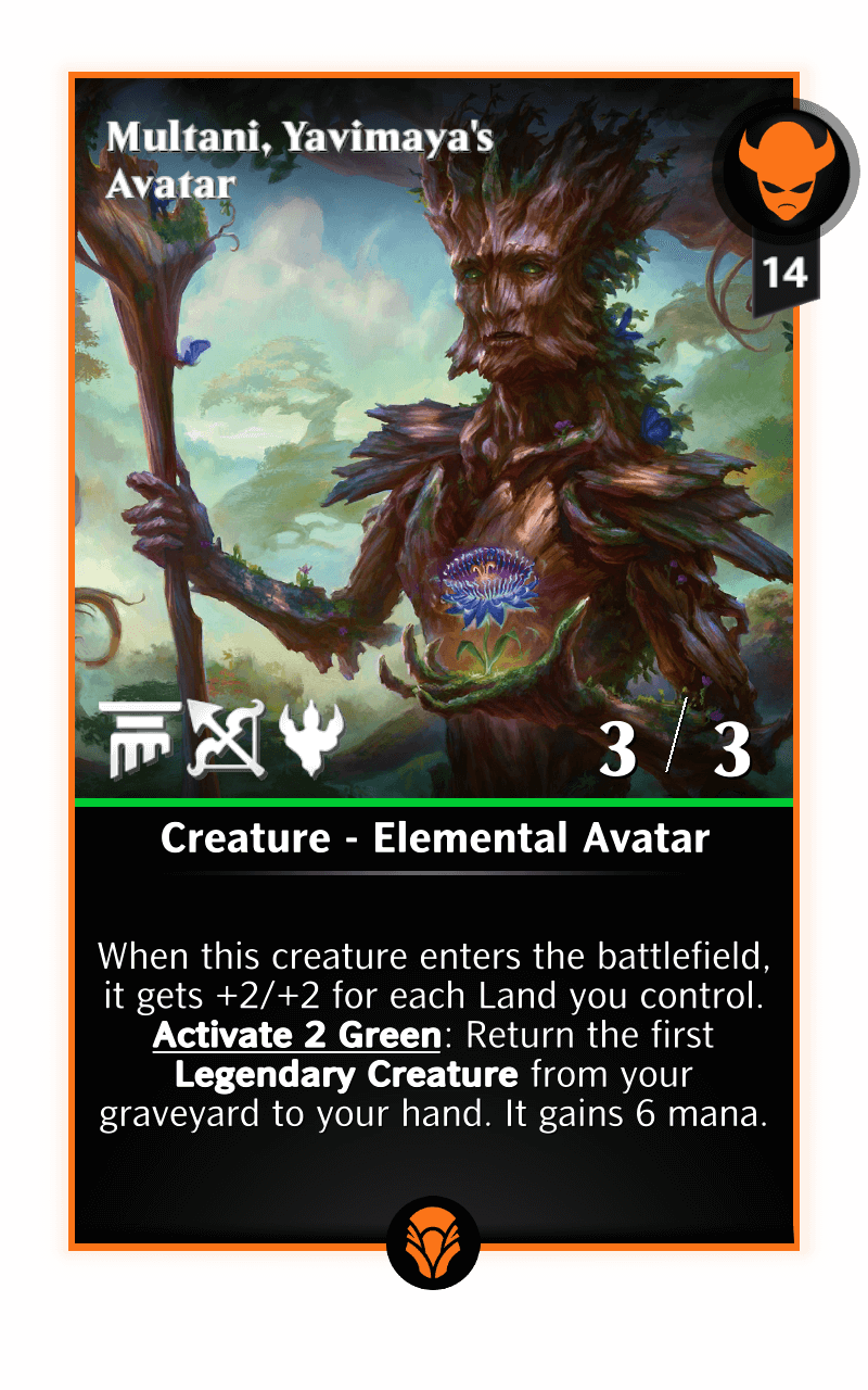 When this creature enters the battlefield, it gets +2/+2 for each Land you control. Activate 2 Green: Return the first Legendary Creature from your graveyard to your hand. It gains 6 mana.