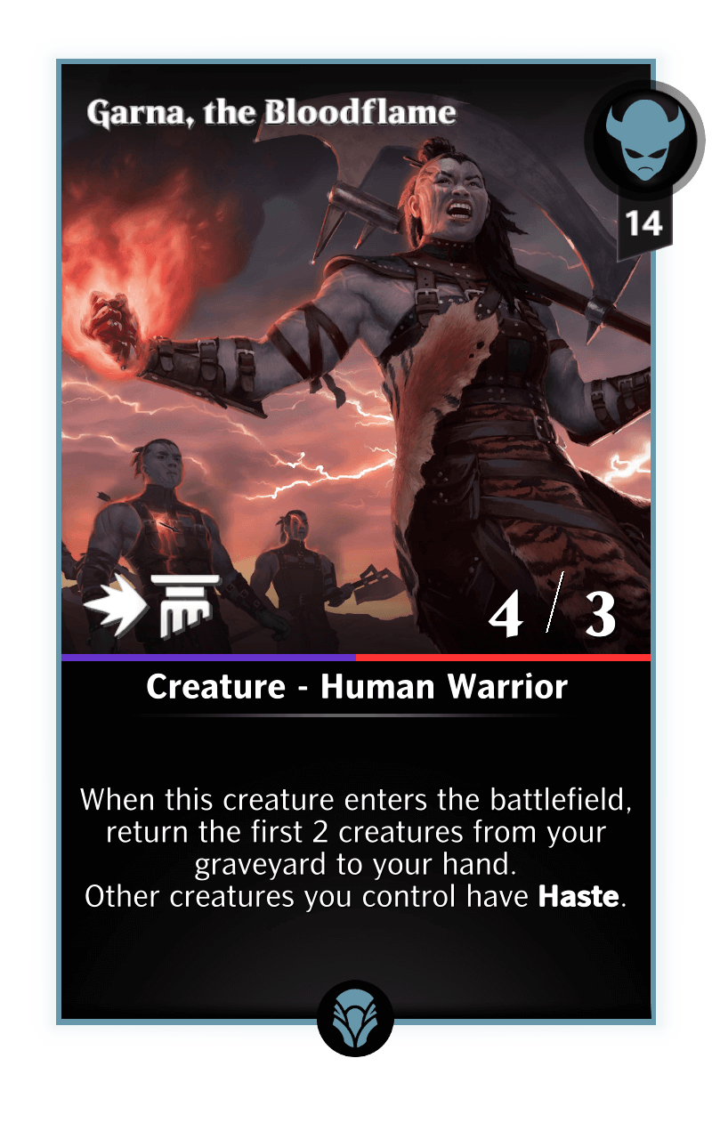 When this creature enters the battlefield, return the first 2 creatures from your graveyard to your hand. Other creatures you control have Haste.