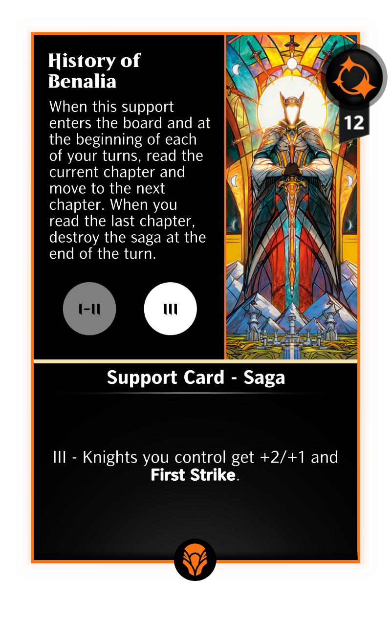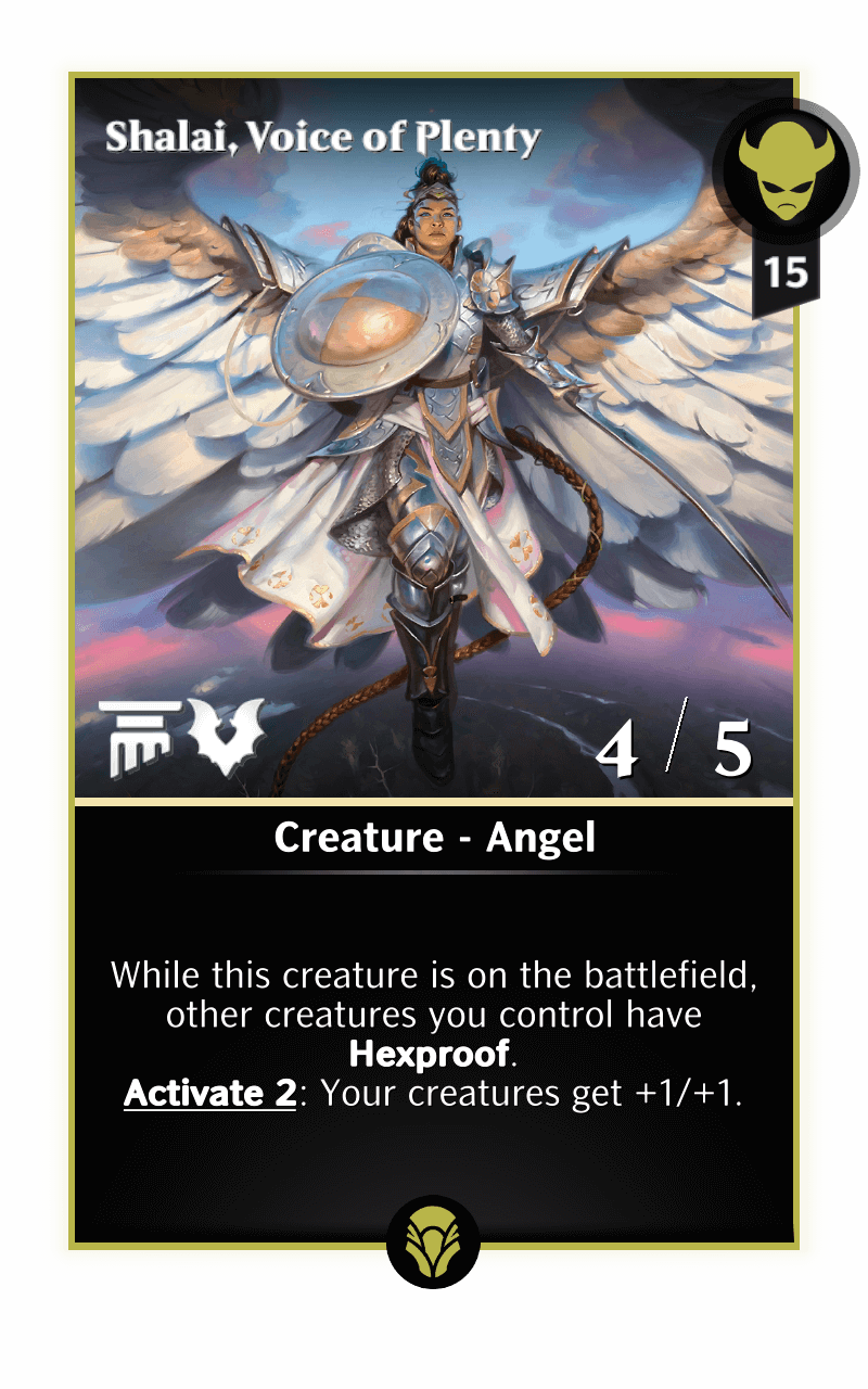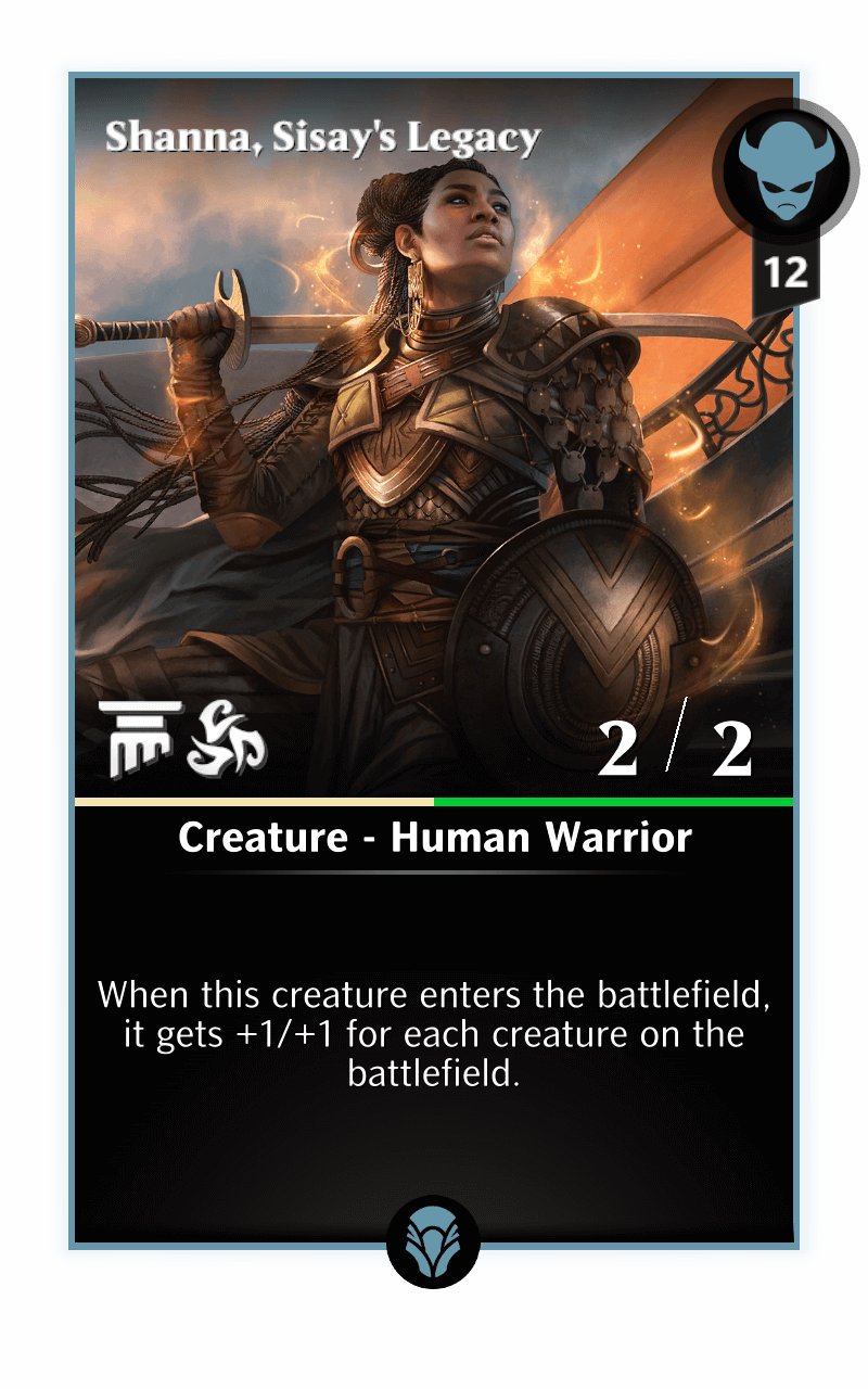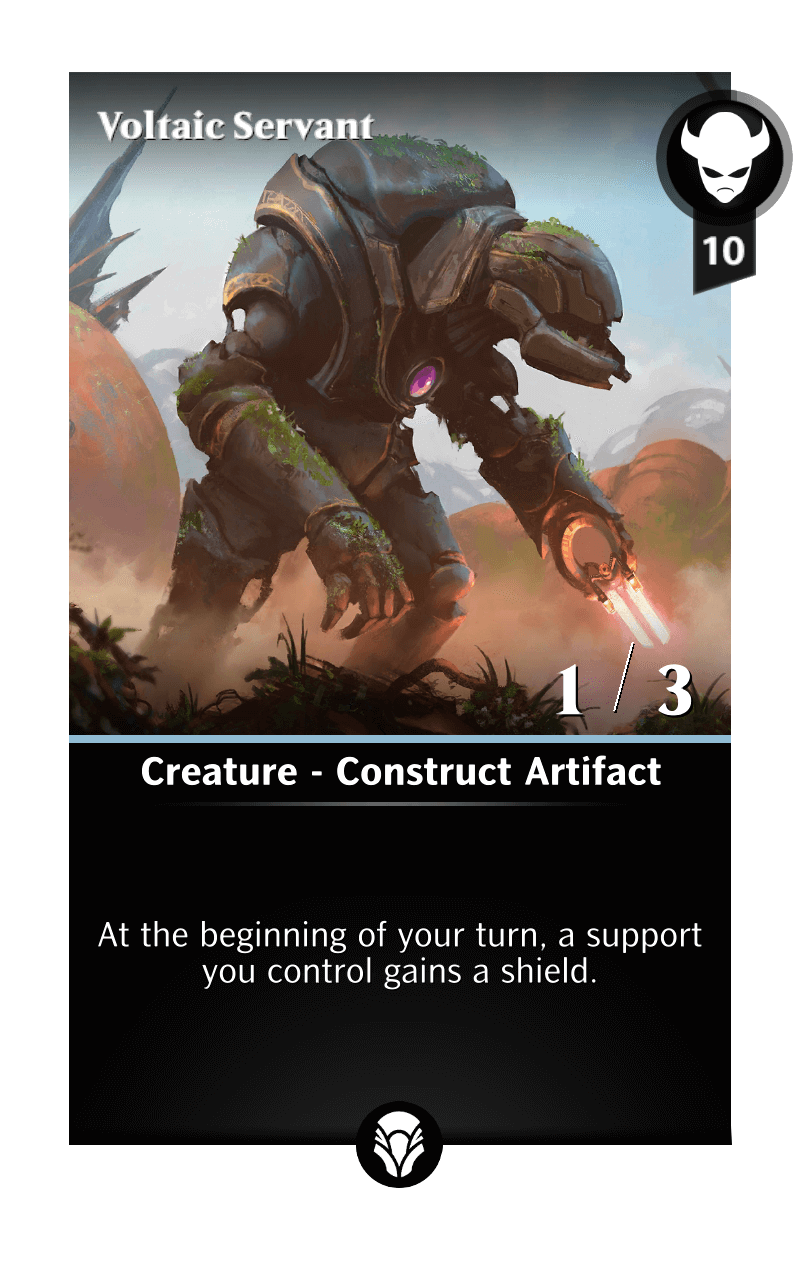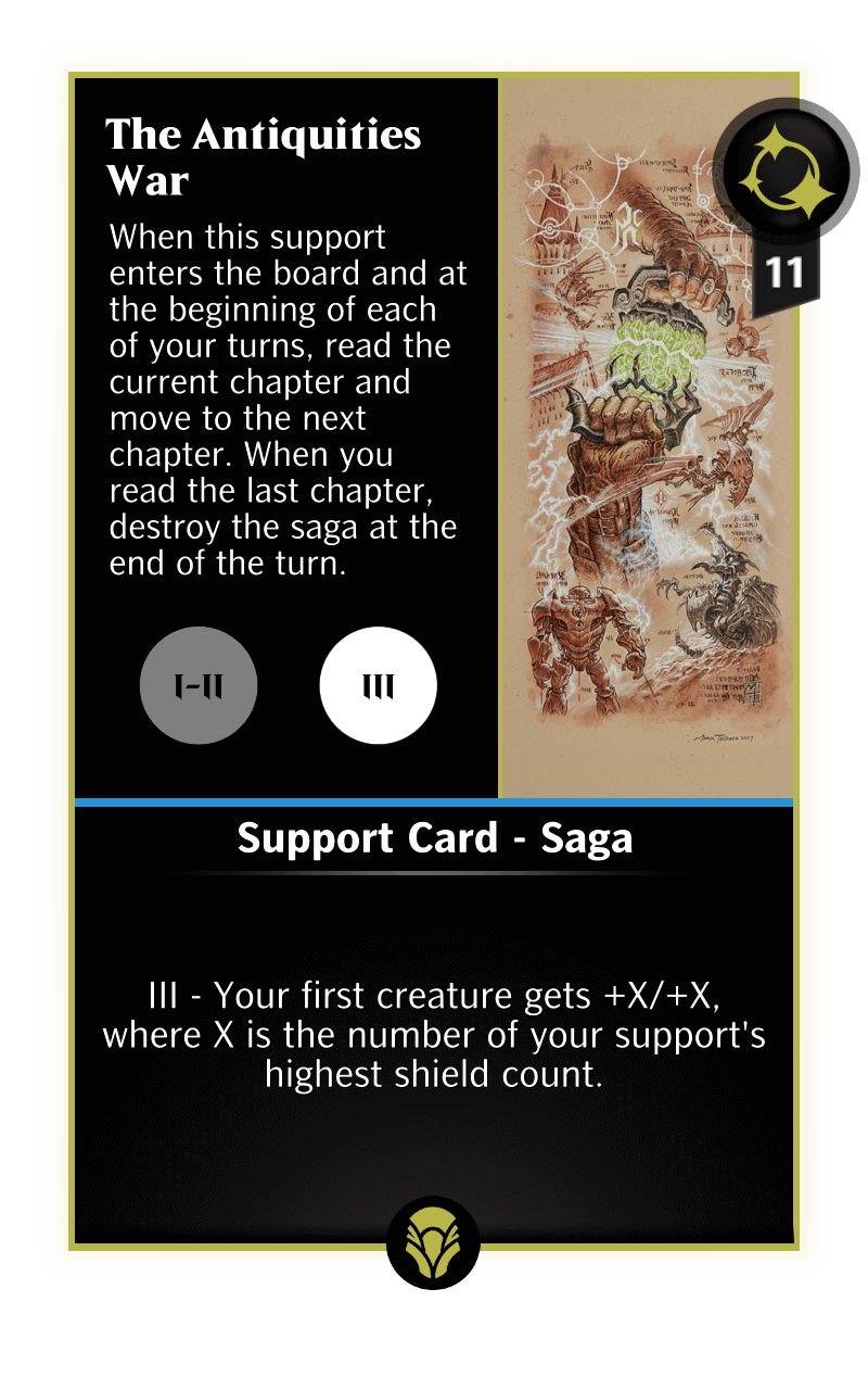 Your first creature gets +X/+X, where X is the number of your support’s highest shield count.