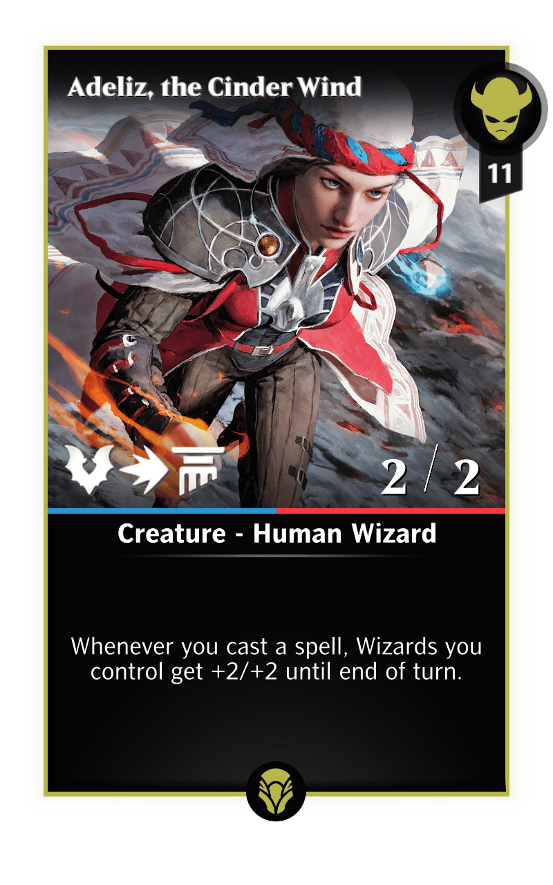 Whenever you cast a spell, Wizards you control get +2/+2 until end of turn.