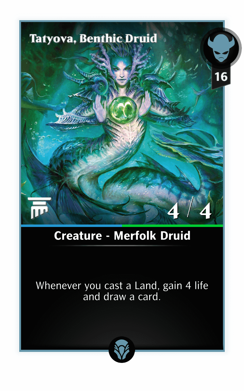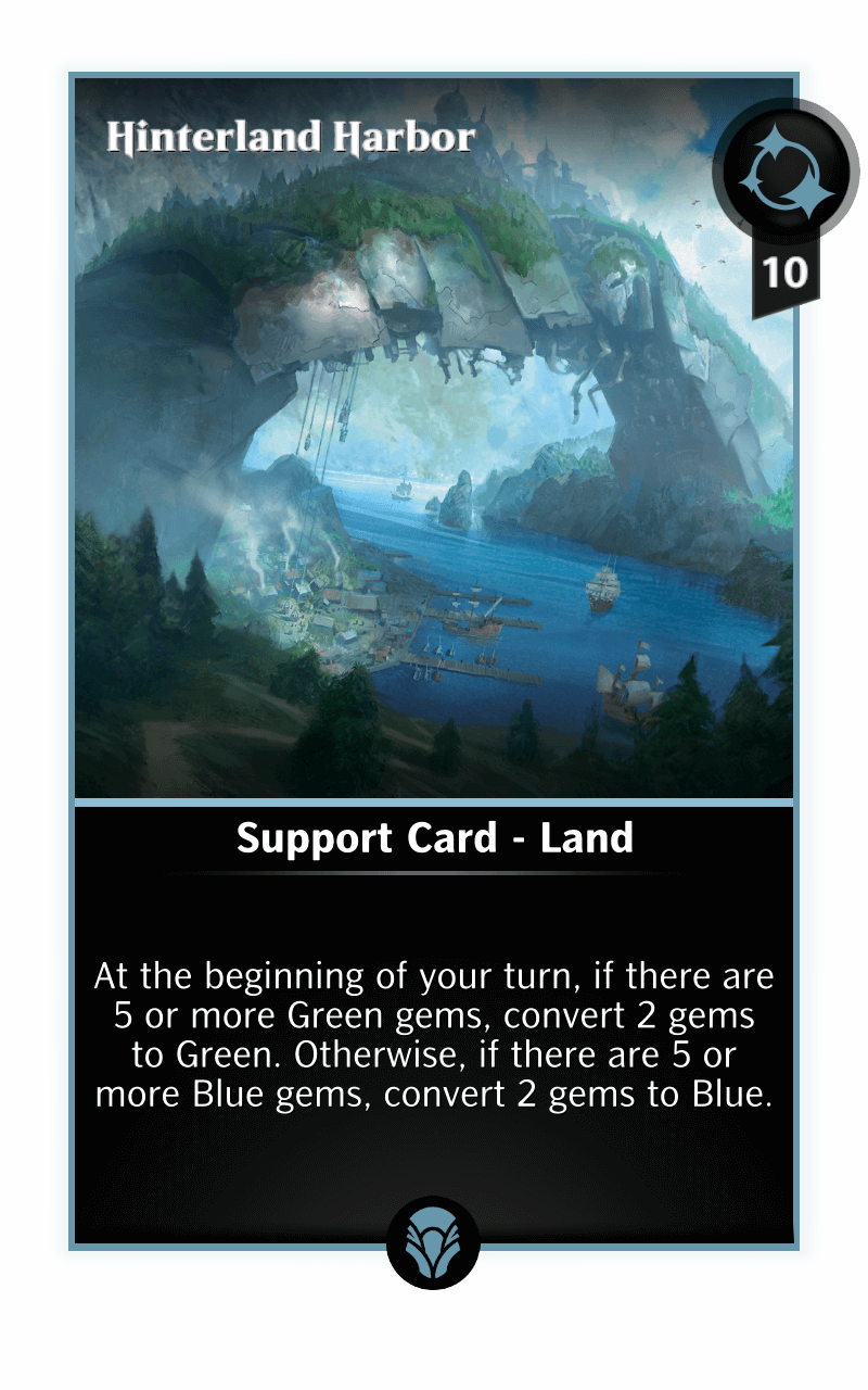 At the beginning of your turn, if there are 5 or more Green gems, convert 2 gems to Green. Otherwise, if there are 5 or more Blue gems, convert 2 gems to Blue.