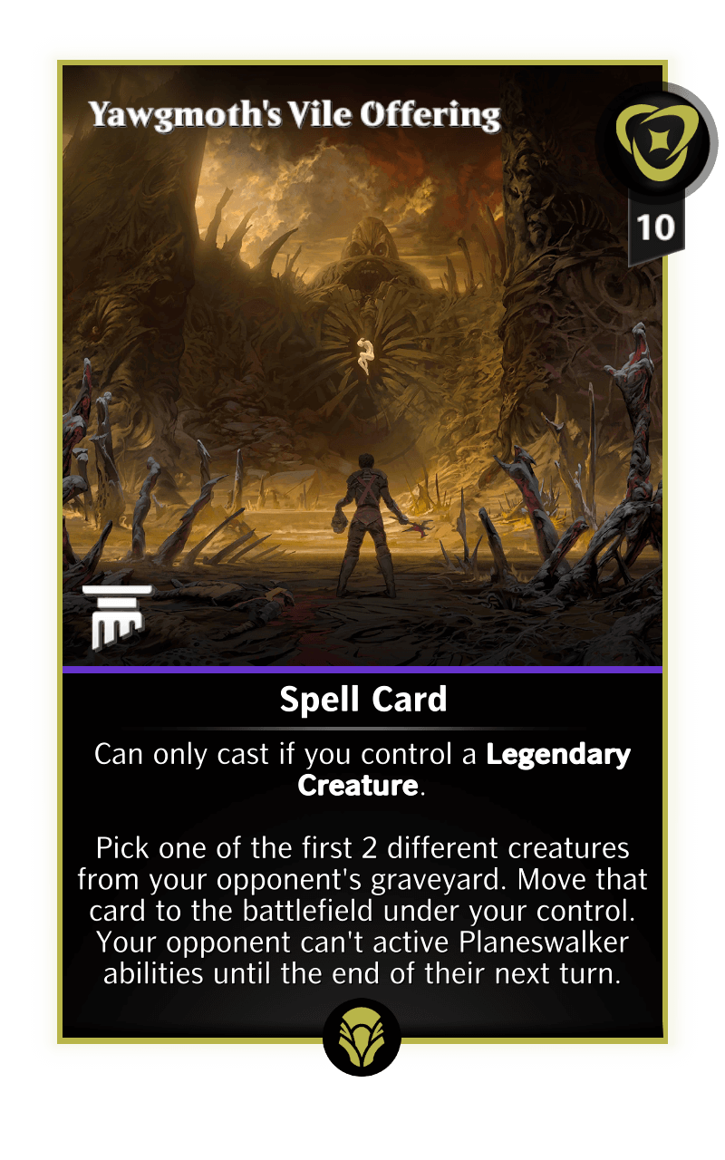 Can only cast if you control a Legendary Creature. Pick one of the first 2 different creatures from your opponent’s graveyard. Move that card to the battlefield under your control. Your opponent can’t active Planeswalker abilities until the end of their next turn.