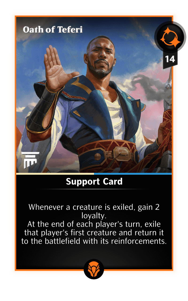 Whenever a creature is exiled, gain 2 loyalty. At the end of each player’s turn, exile that player’s first creature and return it to the battlefield with its reinforcements.
