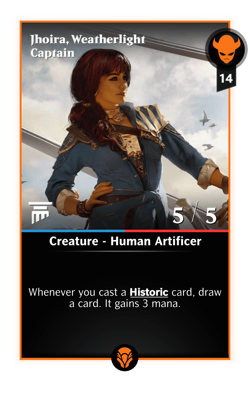 Whenever you cast a Historic card, draw a card. It gains 3 mana.