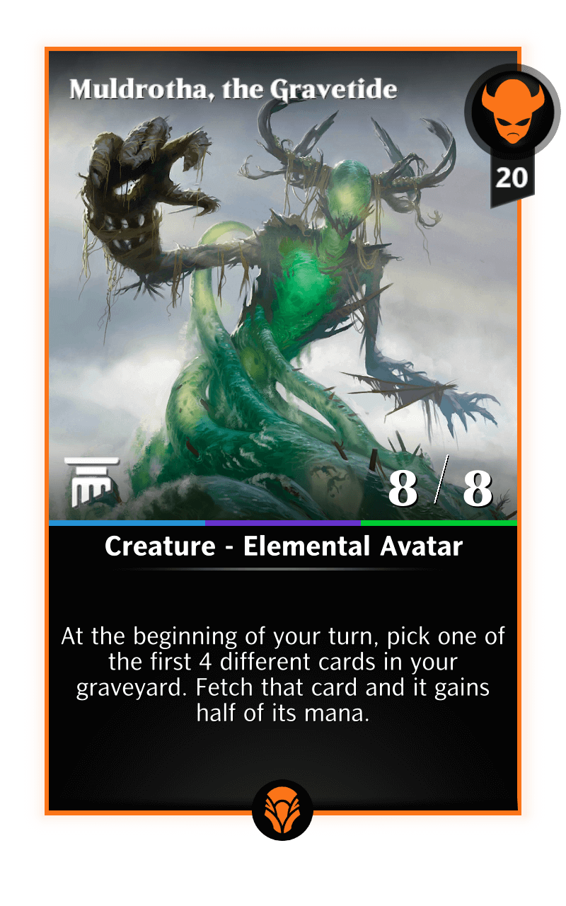 At the beginning of your turn, pick one of the first 4 different cards in your graveyard. Fetch that card and it gains half of its mana.