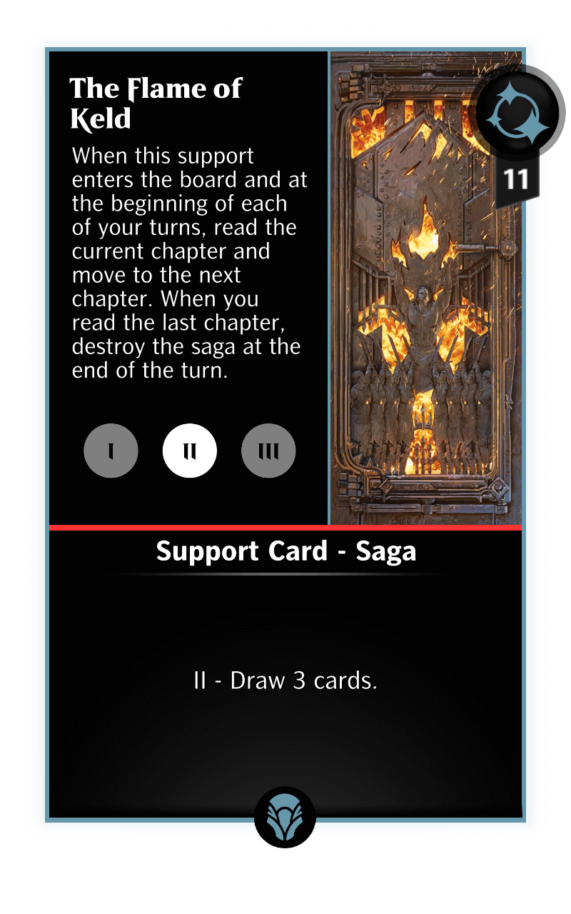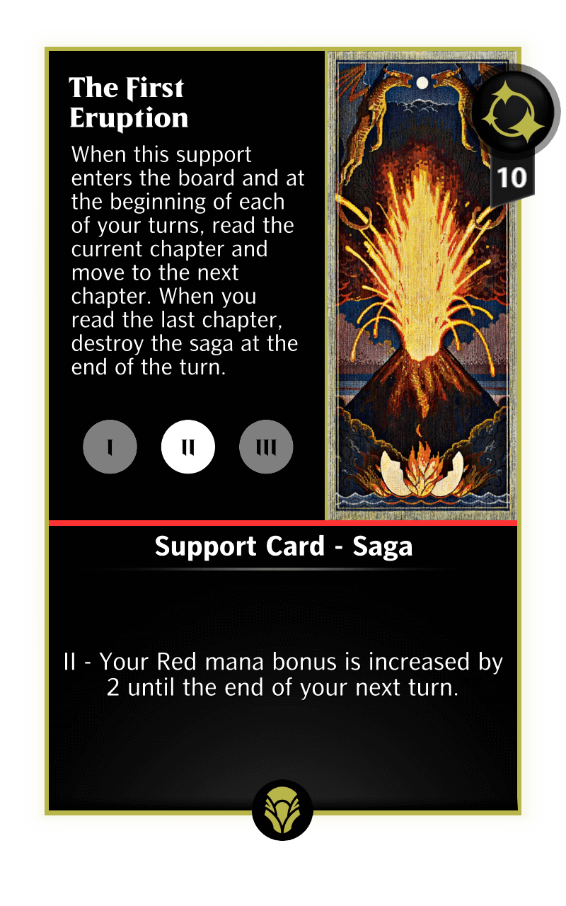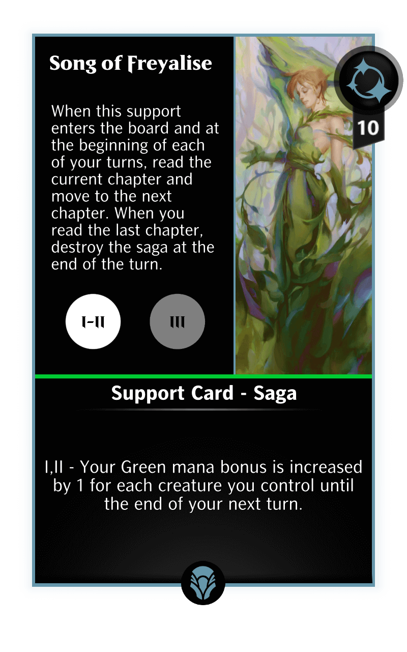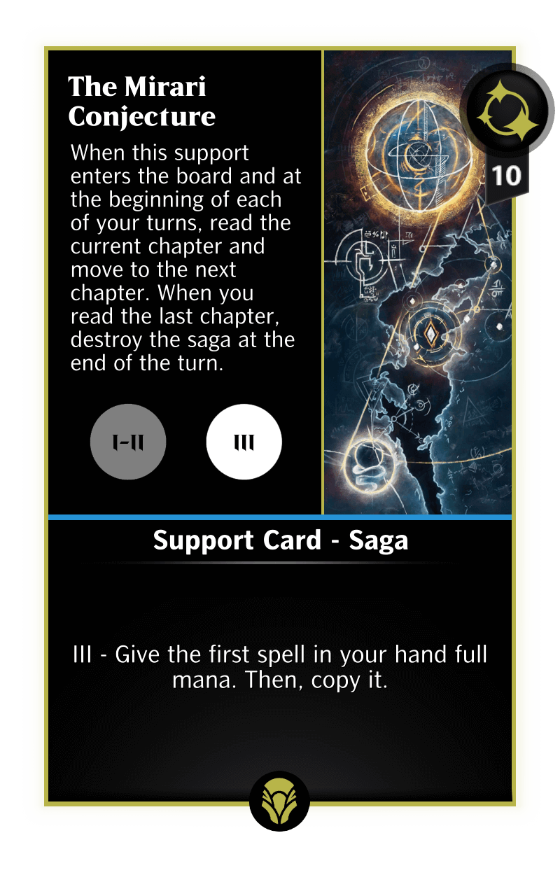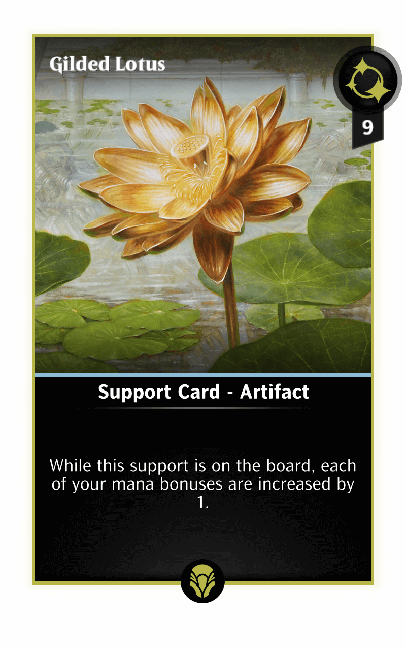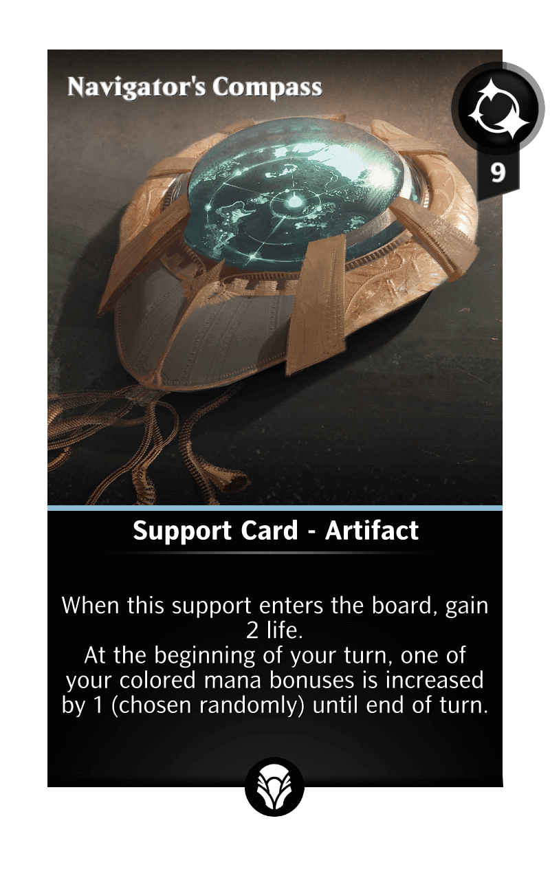 At the beginning of your turn, gain 3 mana. When this support is destroyed, draw a card.