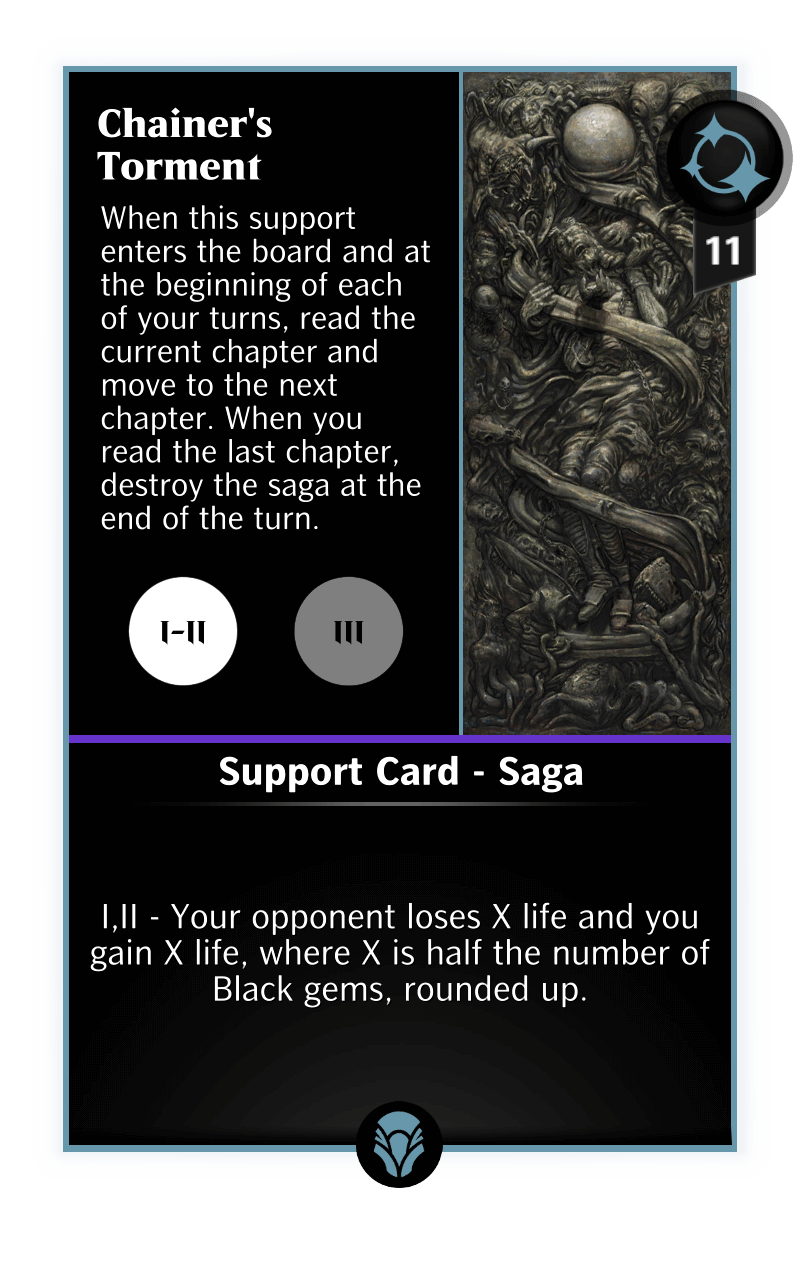 Your opponent loses X life and you gain X life, where X is half the number of Black gems, rounded up. Create a Chainer’s Horror Token.