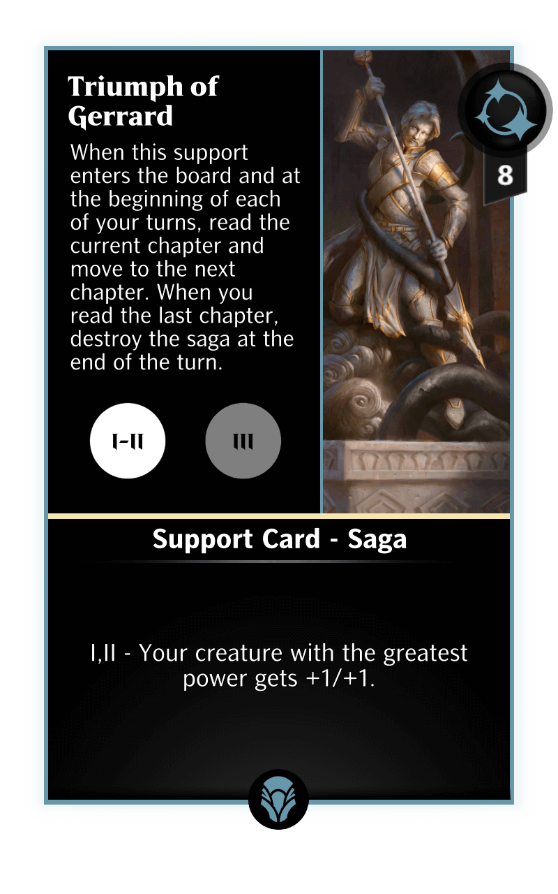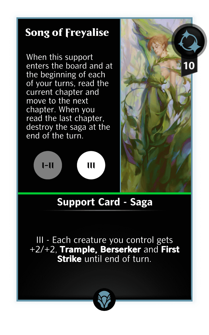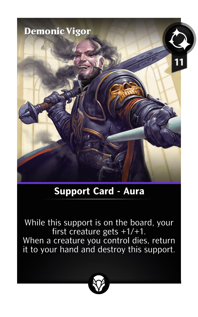 Fetch the next support card from your library. It gains 4 mana. Your first creature gets +X/+X, where X is the number of your support’s highest shield count.