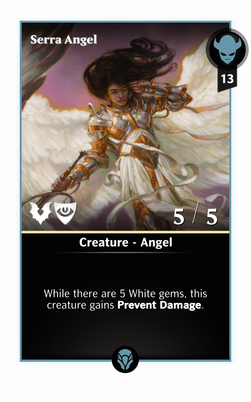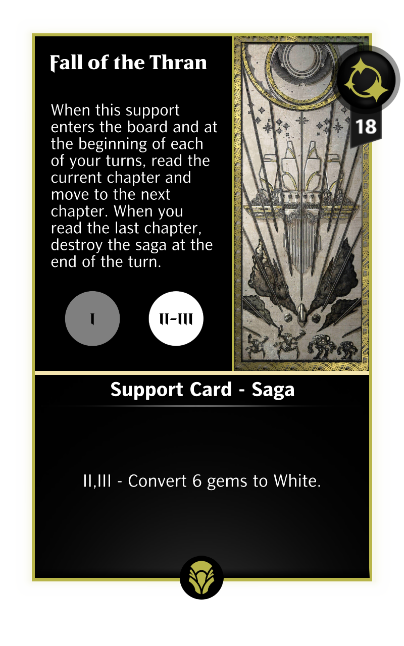 At the beginning of your turn, if there are 5 or more Red gems, convert 2 gems to Red. Otherwise, if there are 5 or more White gems, convert 2 gems to White.