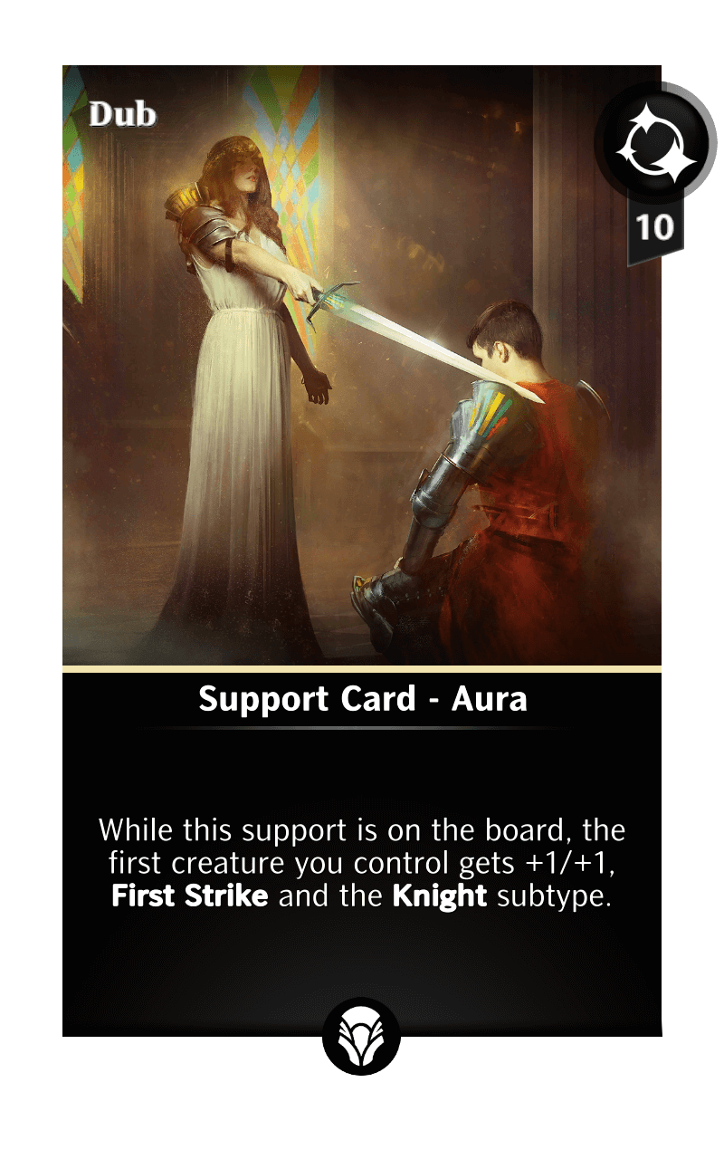 While this support is on the board, the first creature you control gets +1/+1, First Strike and the Knight subtype.