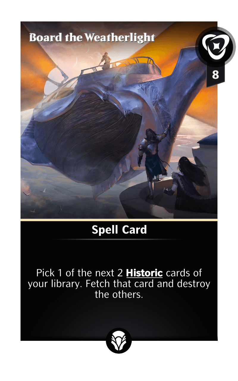 Pick 1 of the next 2 Historic cards of your library. Fetch that card and destroy the others.