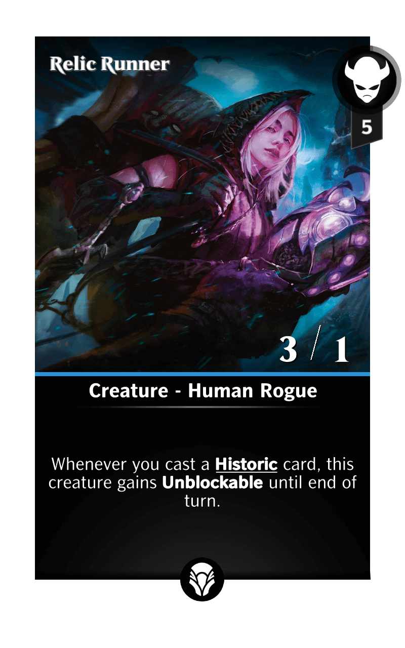 Whenever you cast a Historic card, this creature gains Unblockable until end of turn.