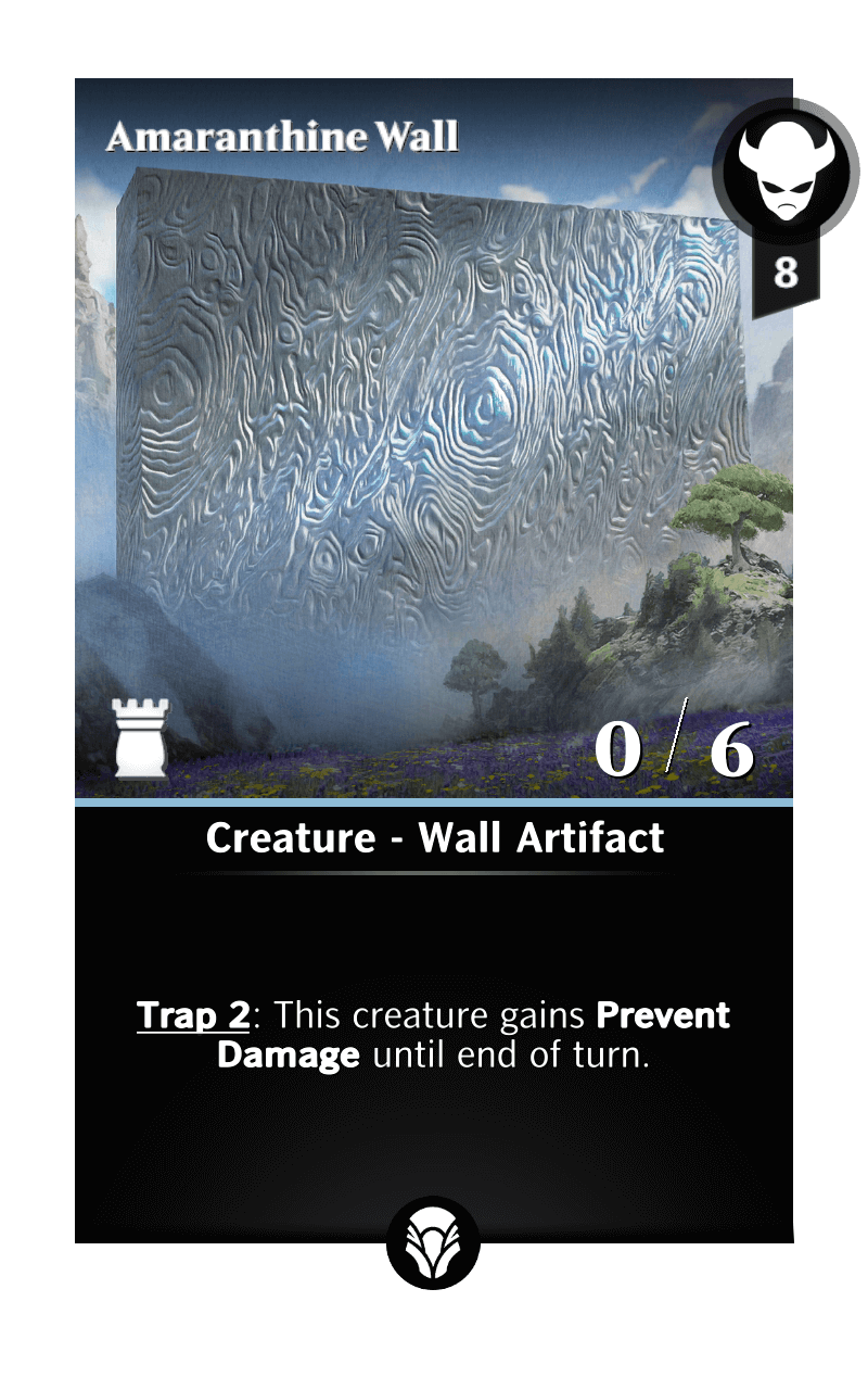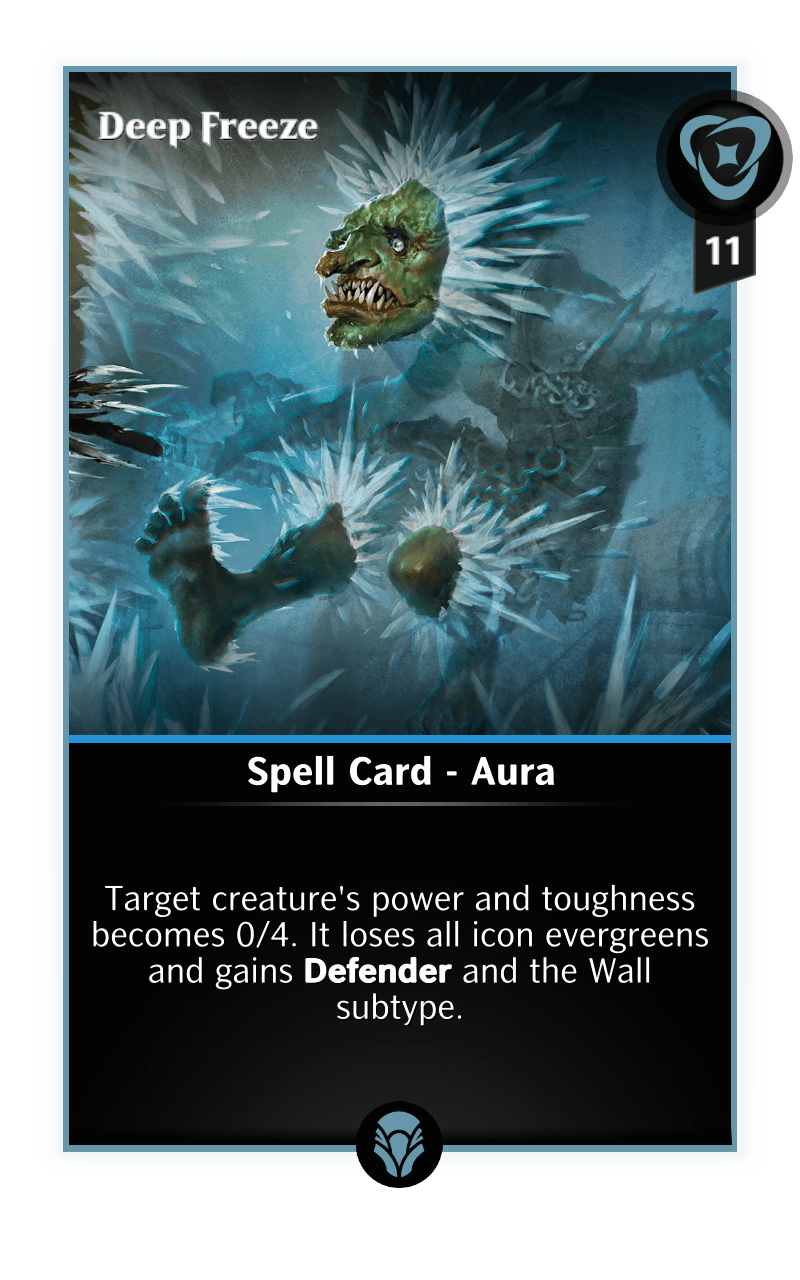 Target creature’s power and toughness becomes 0/4. It loses all icon evergreens and gains Defender and the Wall subtype.