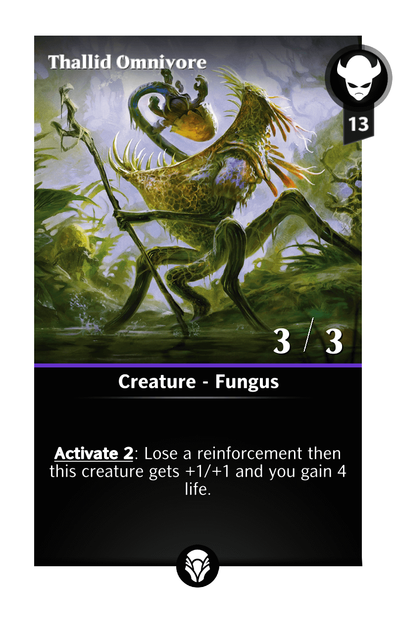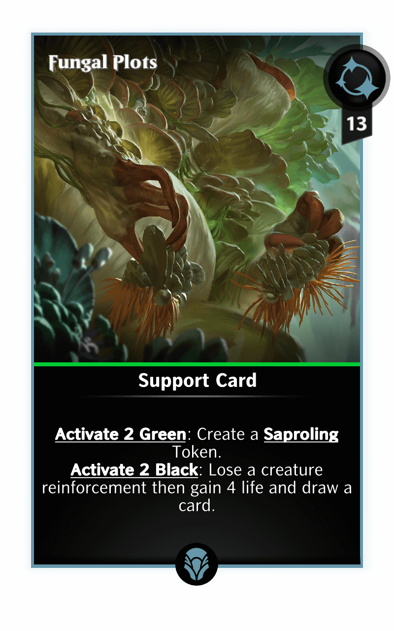 Activate 2 Green: Create a Saproling Token. Activate 2 Black: Lose a creature reinforcement then gain 4 life and draw a card.