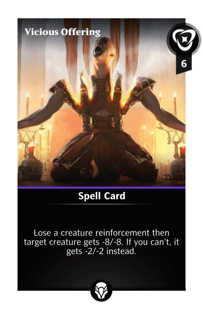 Lose a creature reinforcement then target creature gets -8/-8. If you can’t, it gets -2/-2 instead.