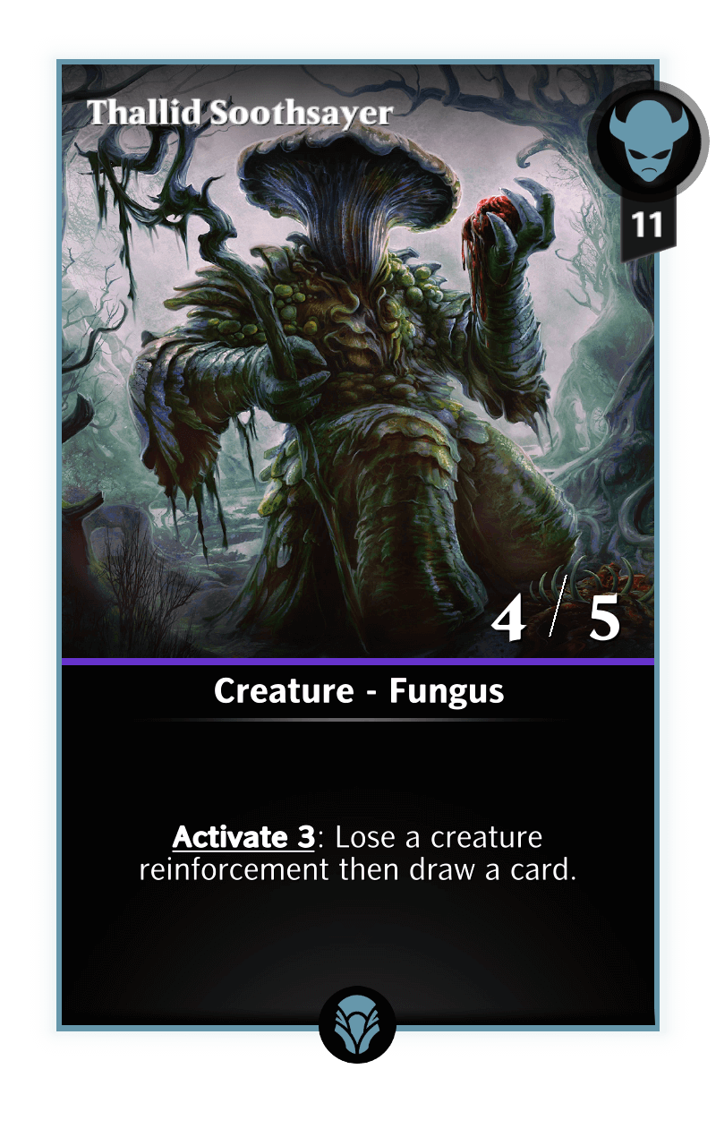 Leader: Saproling. Whenever a creature you control dies or loses a reinforcement, this creature deals 2 damage to your opponent and you gain 2 life. Activate 2 Green: Create a Saproling Token. Activate 2 Black: Lose a creature reinforcement then your opponent’s first creature gets -2/-2.