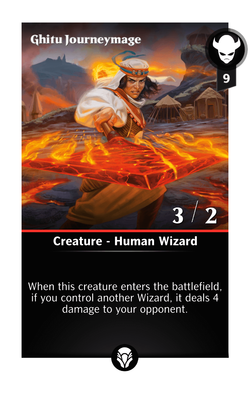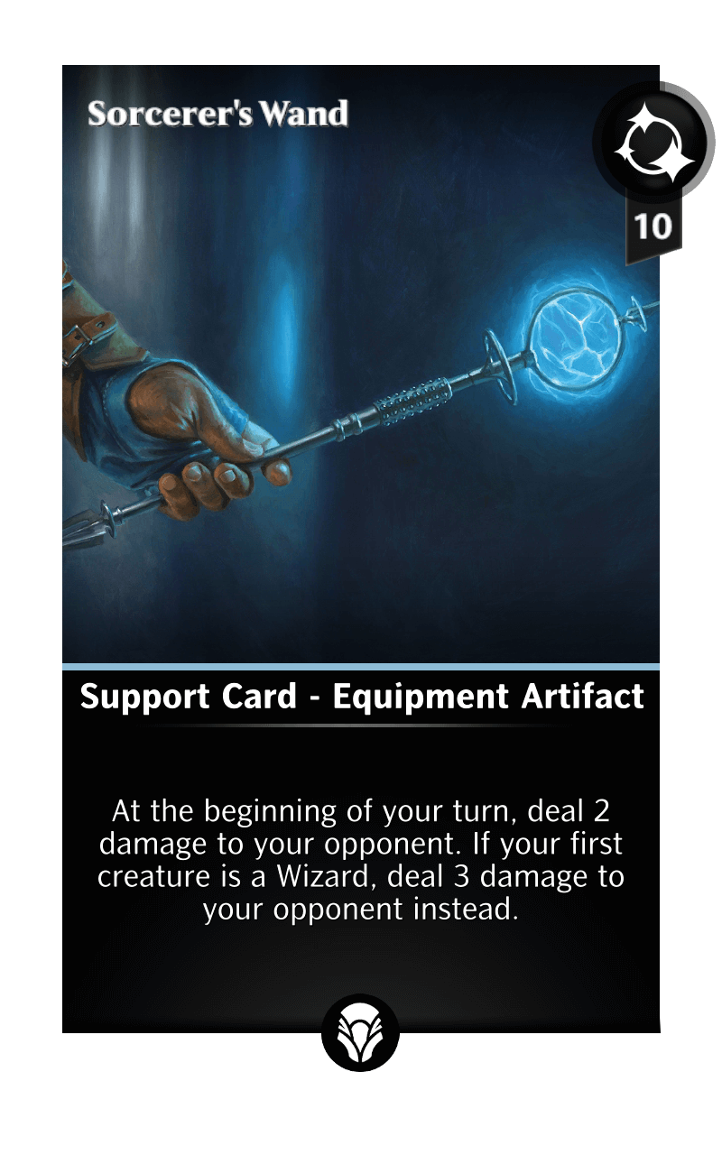 At the beginning of your turn, deal 2 damage to your opponent. If your first creature is a Wizard, deal 3 damage to your opponent instead.