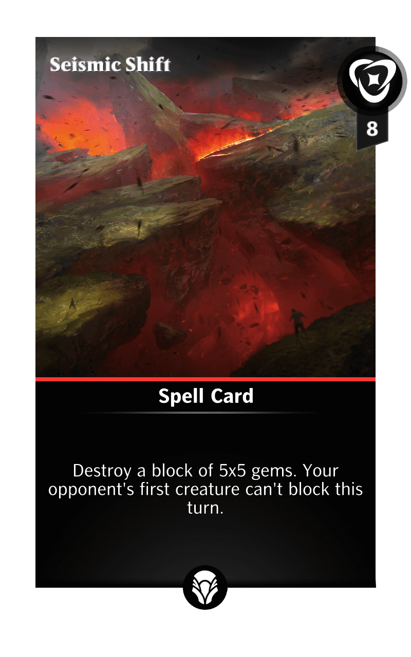 Destroy a block of 5×5 gems. Your opponent’s first creature can’t block this turn.
