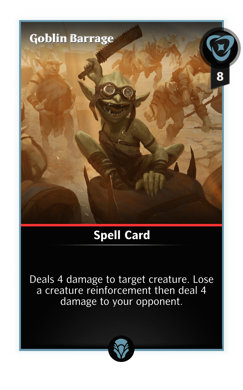 Deals 4 damage to target creature. Lose a creature reinforcement then deal 4 damage to your opponent.