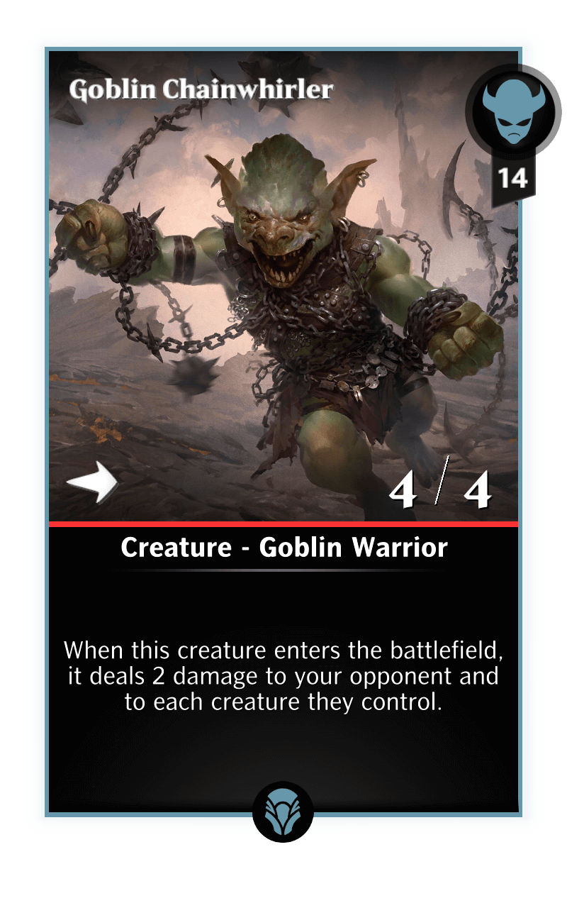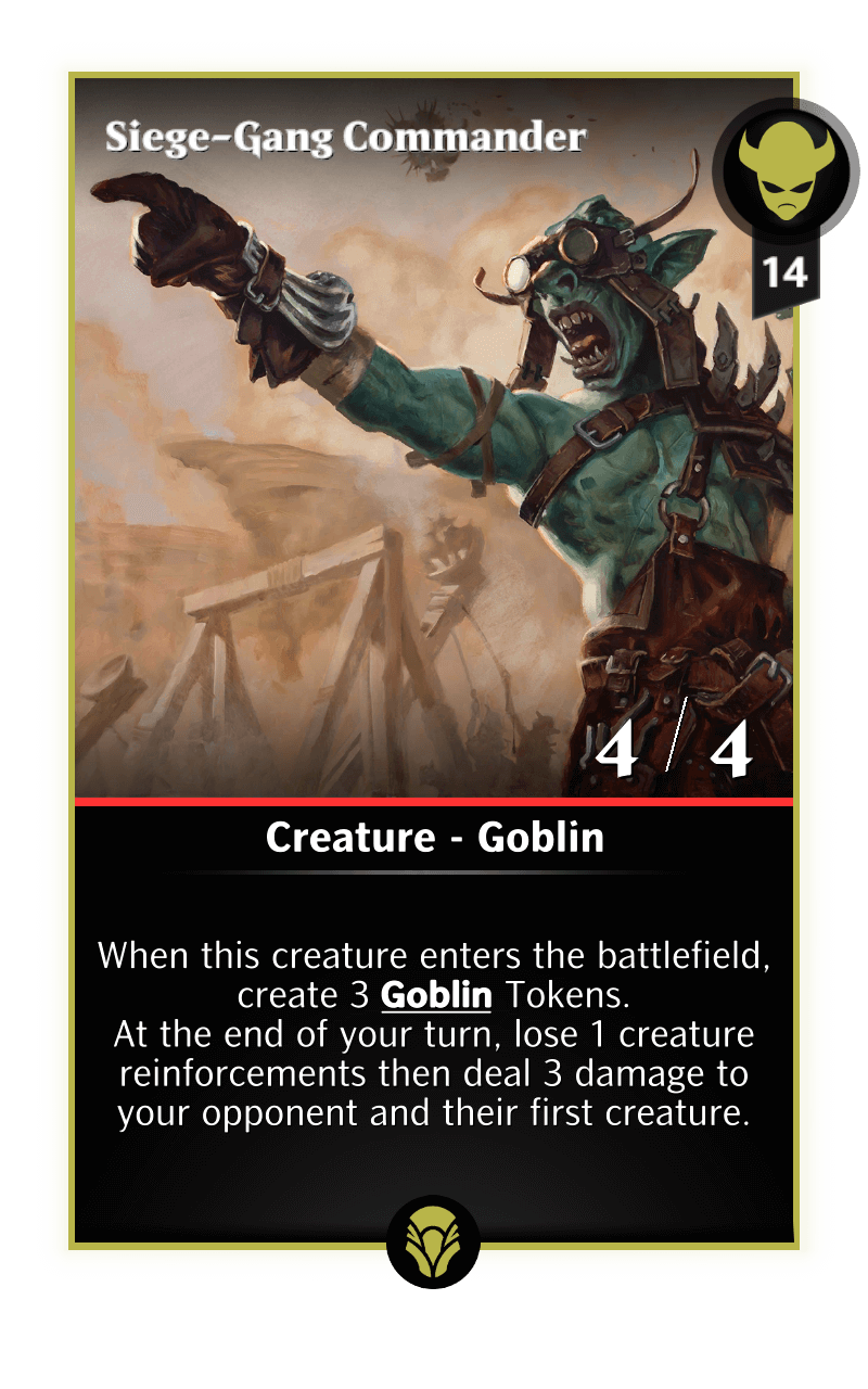 When this creature enters the battlefield, create 3 Goblin Tokens. At the end of your turn, lose 1 creature reinforcements then deal 3 damage to your opponent and their first creature.