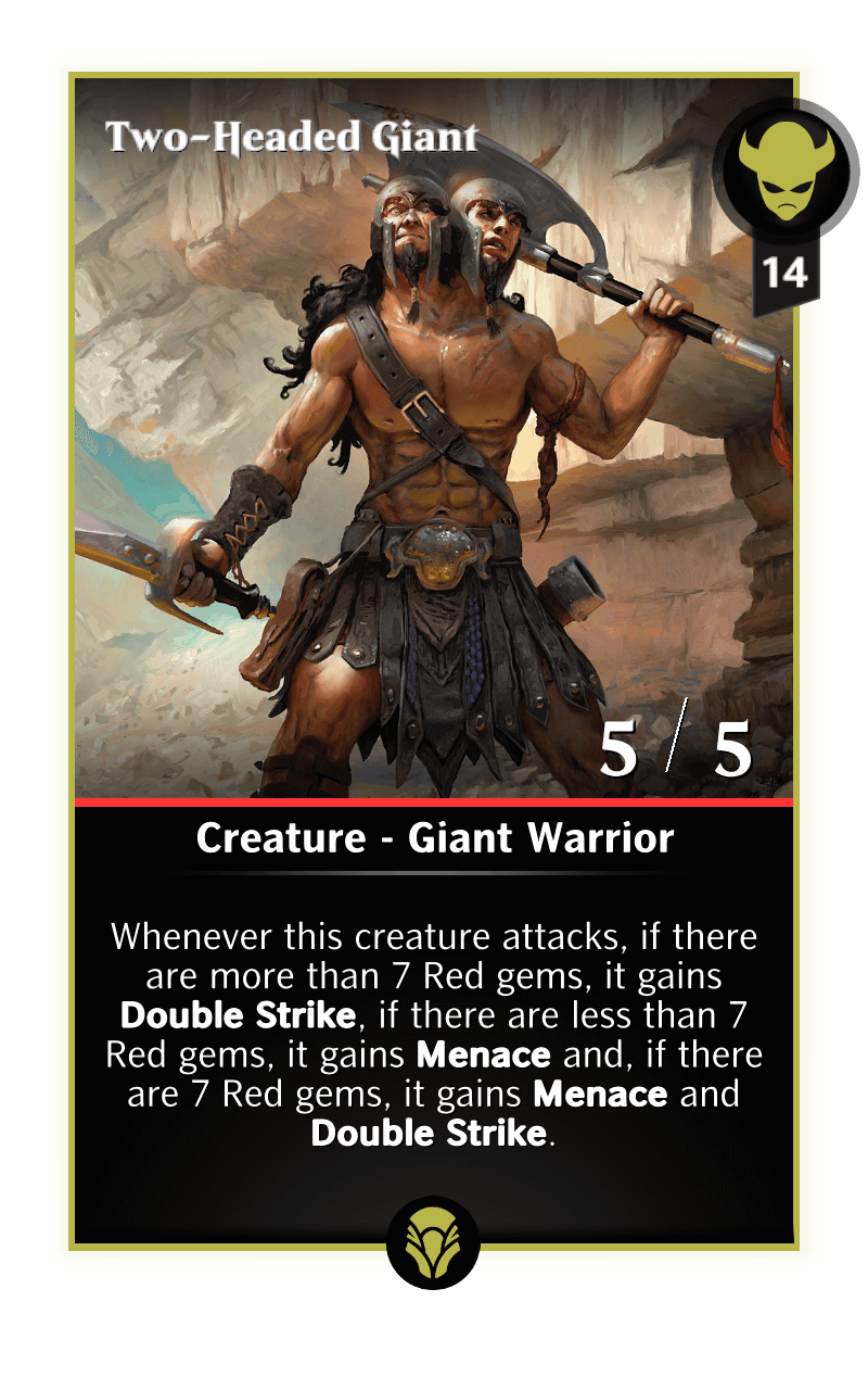 Whenever this creature attacks, if there are more than 7 Red gems, it gains Double Strike, if there are less than 7 Red gems, it gains Menace and, if there are 7 Red gems, it gains Menace and Double Strike.