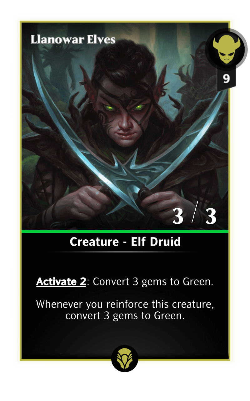 Activate 2: Convert 3 gems to Green. Whenever you reinforce this creature, convert 3 gems to Green.