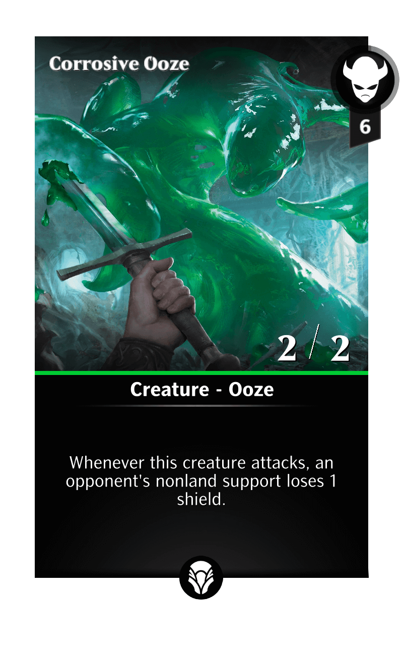 Whenever this creature attacks, an opponent’s nonland support loses 1 shield.