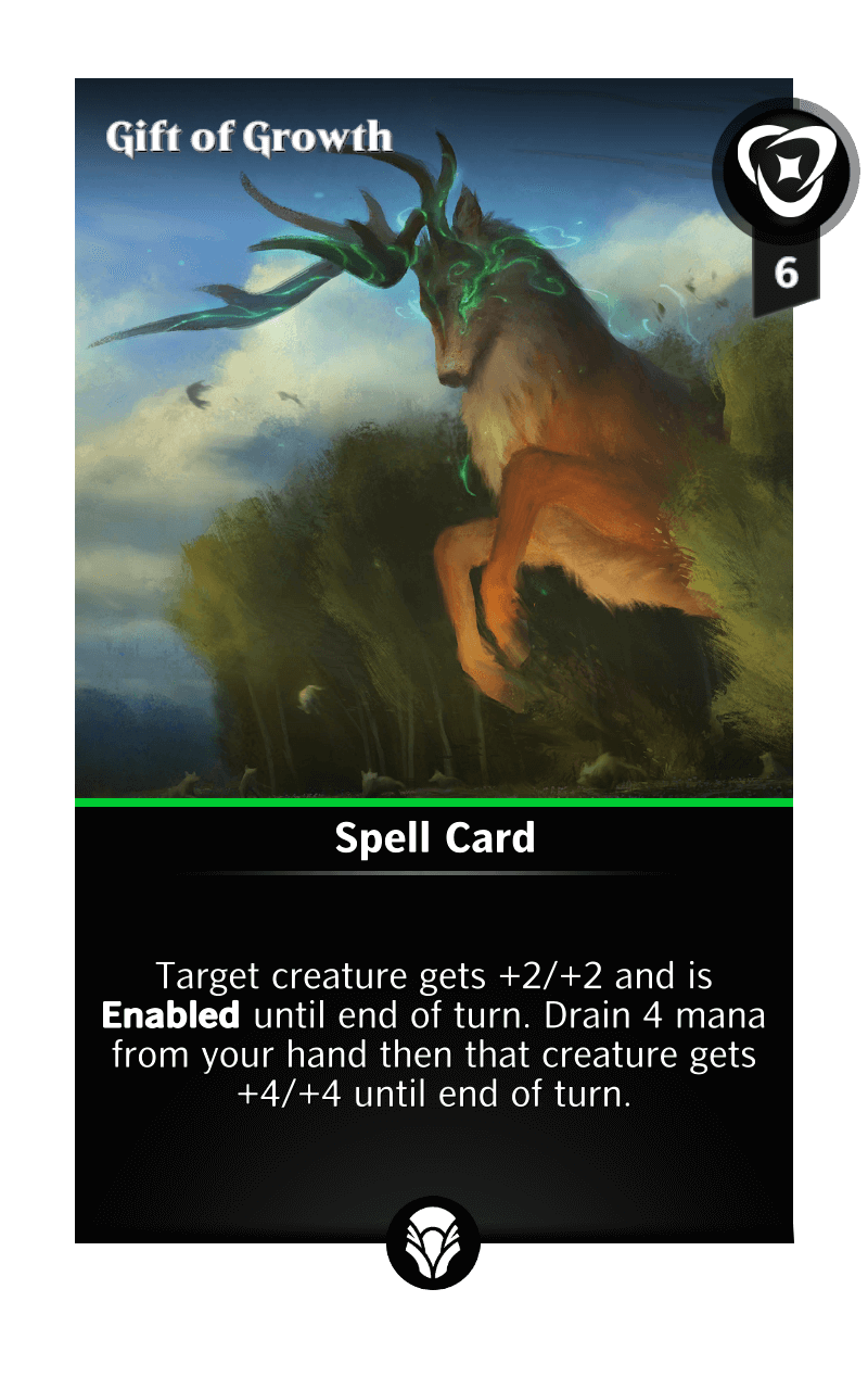 Target creature gets +2/+2 and is Enabled until end of turn. Drain 4 mana from your hand then that creature gets +4/+4 until end of turn.