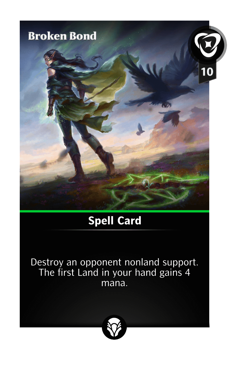 Destroy an opponent nonland support. The first Land in your hand gains 4 mana.