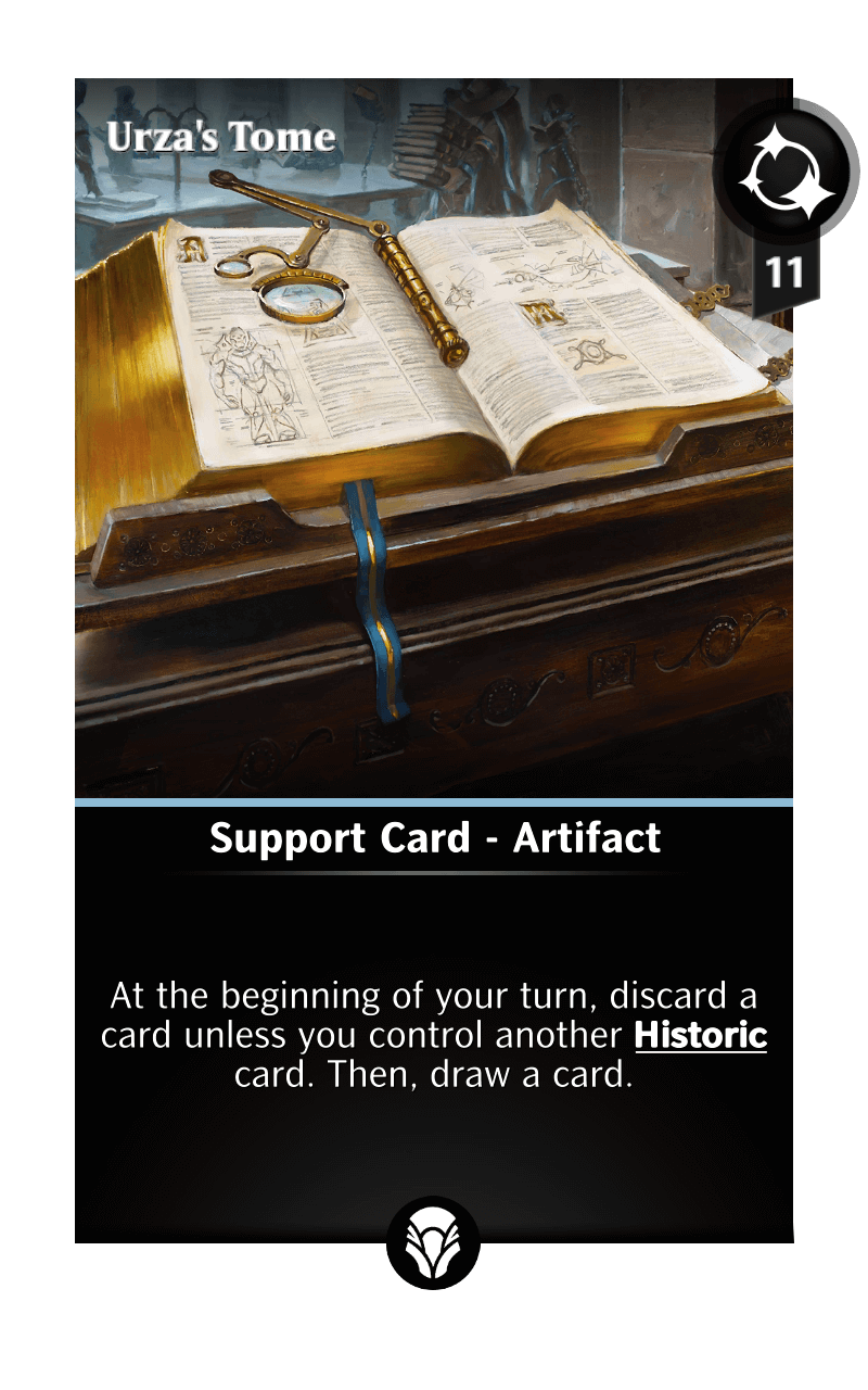 At the beginning of your turn, discard a card unless you control another Historic card. Then, draw a card.